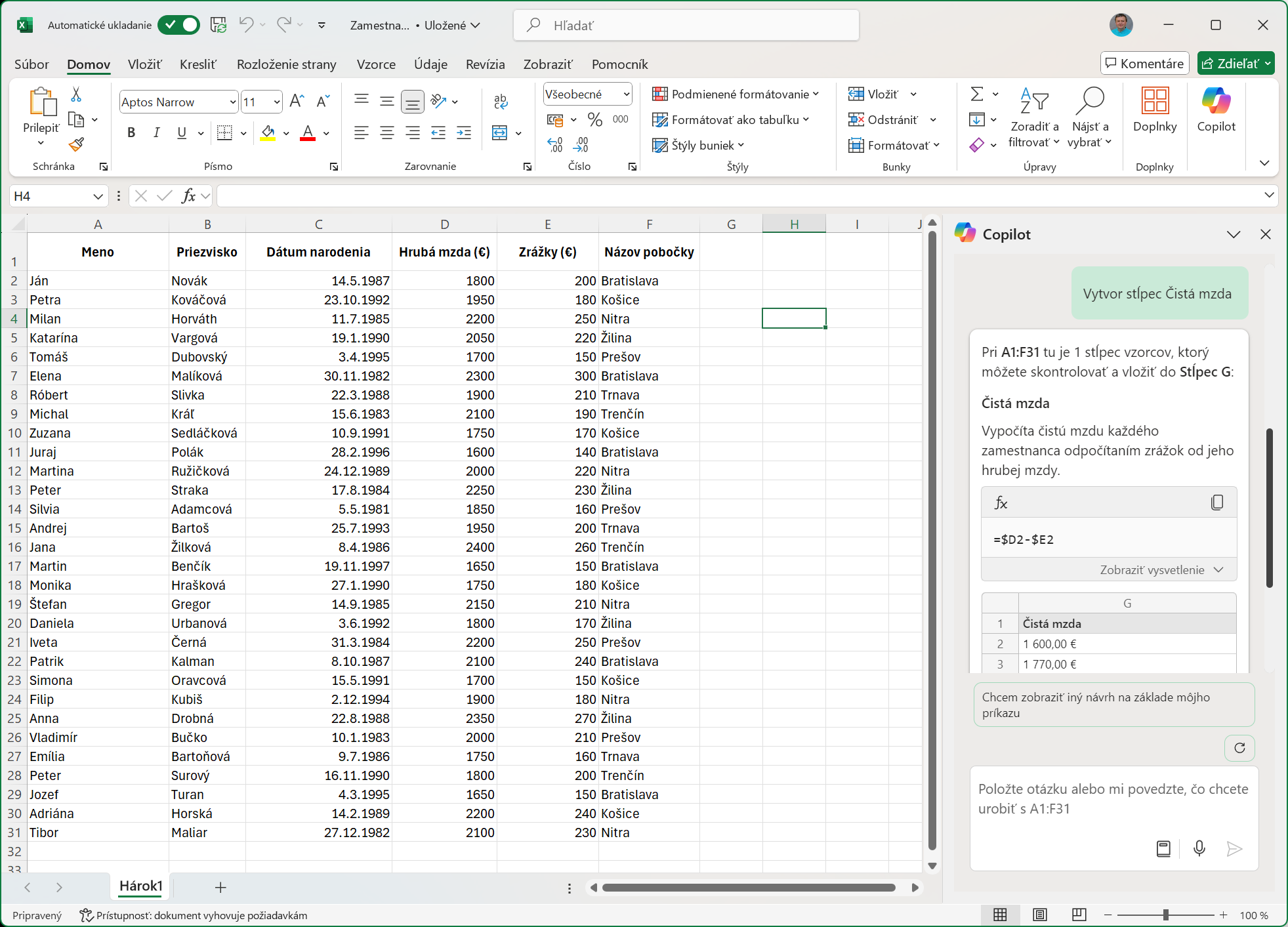 Copilot ponúkne farbu výplne aj písma, ak ste s nimi spokojní, môžete zmenu aplikovať. Na zvýraznenie sa použije podmienené formátovanie, takže aj po zmene údajov v stĺpci Hrubá mzda budú označené tri najvyššie hodnoty.