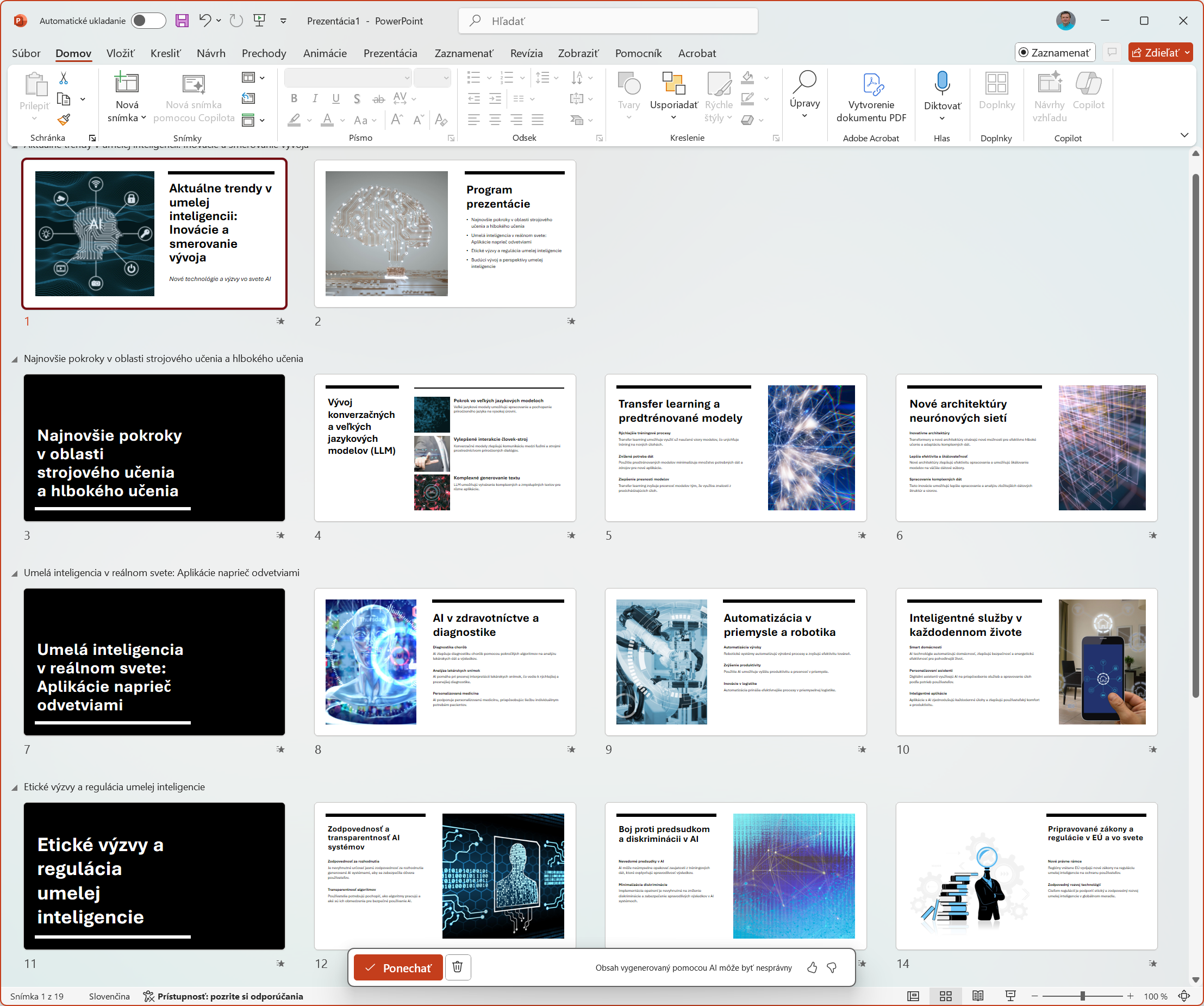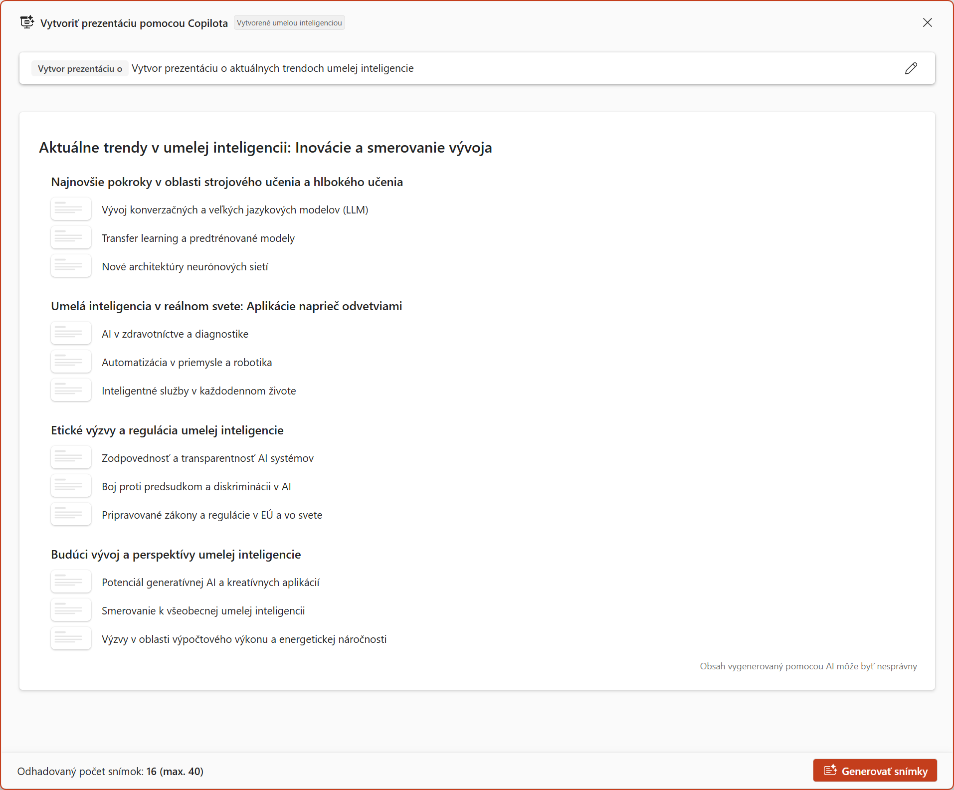„Vytvor prezentáciu o trendoch umelej inteligencie“ a AI pripraví osnovu aj návrhy snímok.