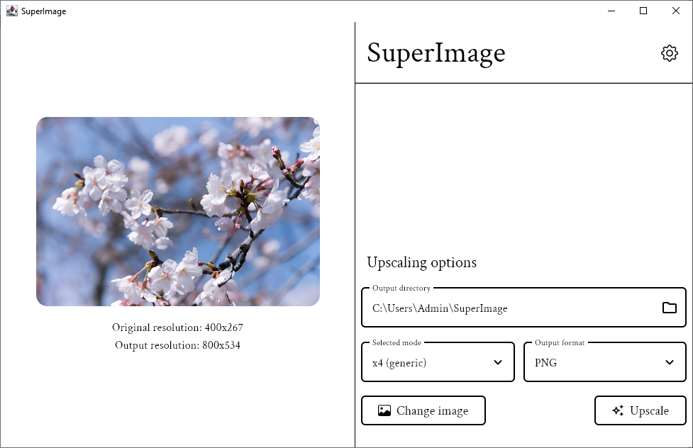 V základe sa obrázky rozmerovo zväčšujú na dvojnásobok (z dôvodu štvornásobného zväčšenia pixelového objemu označené pre niekoho mätúco ako 4× Generic). Podobne ako v programe Upscayl sa používa model Real-ESRGAN. V roletke si môžete vybrať štvornásobné zväčšenie (16× Generic) a takisto nastavenie Drawing, ktoré vyberajte vždy, keď namiesto fotografie zväčšujete kresbu alebo digitálnu ilustráciu.