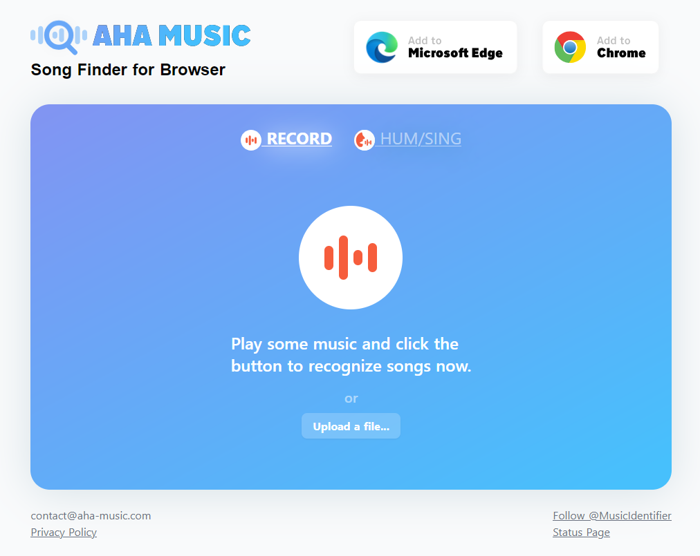 Ak chcete identifikovať hudbu v súbore, napríklad vo videu, ktoré máte alebo ste si nahrali, kliknite na tlačidlo Upload file a nahrajte ho. Môže ísť o akýkoľvek multimediálny súbor do veľkosti 50 MB, pričom sa bude rozpoznávať hudba z jeho prvých 60 sekúnd.