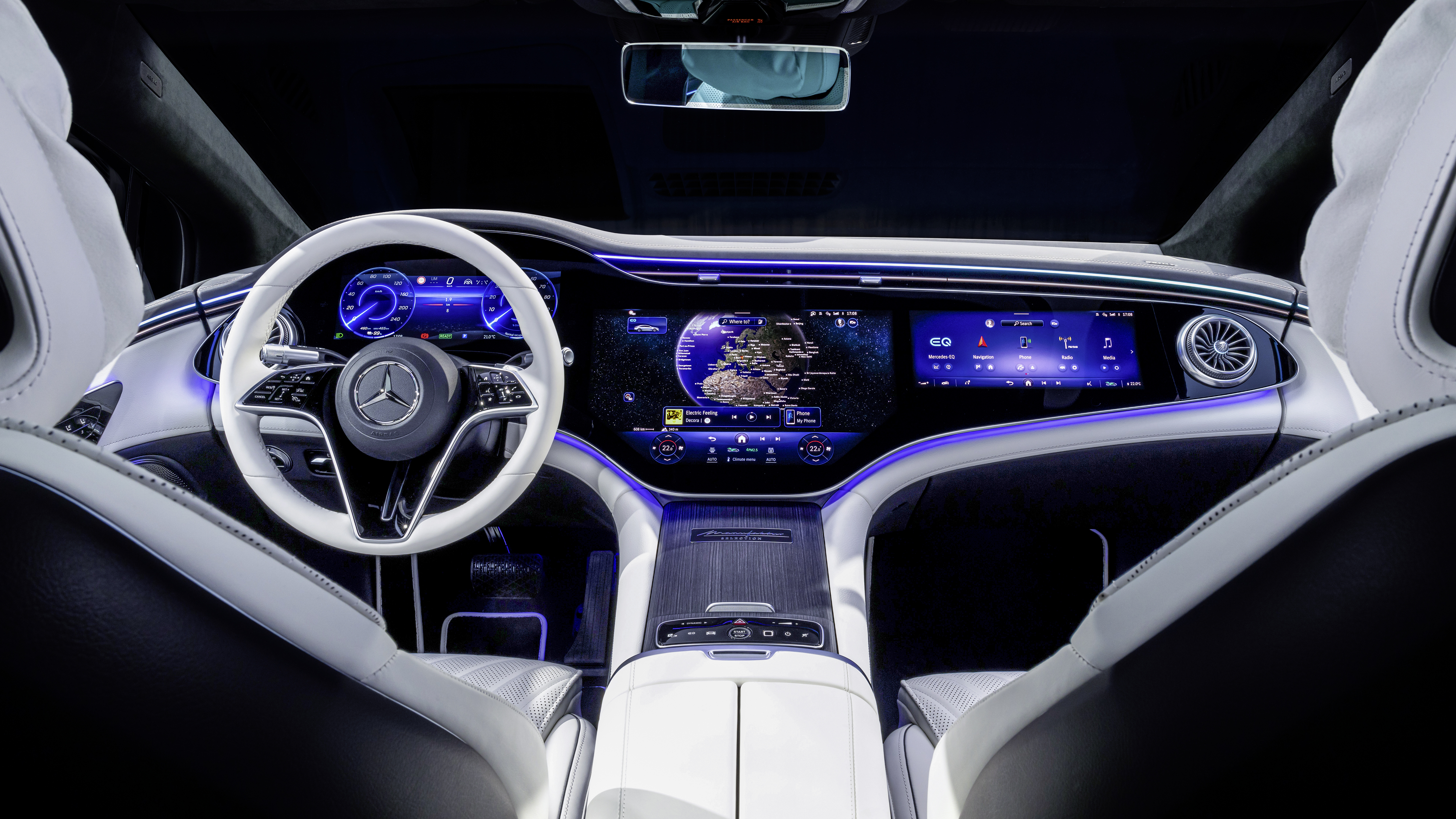 … hyperobrazovka MBUX je teraz súčasťou sériovej výbavy modelu EQS? Tri displeje takmer plynule prechádzajú jeden do druhého a vytvárajú pruh obrazoviek so šírkou viac ako 141 cm.