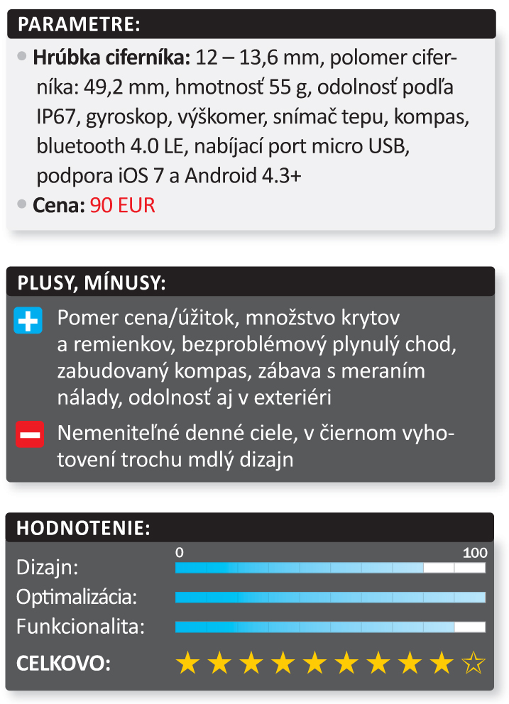 Orientácia v menu je veľmi jednoduchá, bezproblémová a najviac sme sa zaujímali o aplikáciu monitorujúcu denné aktivity. Zaznamenáva počet prejdených krokov, spálené kalórie, prejdenú vzdialenosť v kilometroch, vašu aktivitu za poslednú hodinu a dĺžku vášho spánku. Znamená to, že hodinky nemusíte odkladať ani v noci, ak chcete mať prehľad o tom, ako dlho a v ktorej časti dňa ste spali. Trochu zamrzí, že denné ciele sú v tomto prípade striktne dané a nemožno ich používateľsky upravovať podľa svojich fyzických možností. Okrem toho možno na požiadanie skontrolovať váš aktuálny srdcový tep, a ak v smartfóne povolíte lokalizačné služby, budete môcť v hodinkách kontrolovať aj predpoveď počasia.