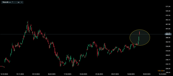 Akcie Tesly (TSLA) v pondelok 16. septembra 2025 opäť prudko vzrástli takmer o 7 %, no deň nakoniec uzavreli poklesom okolo 3,5 %. Minulý týždeň spoločnosť potvrdila svoju plnú dôveru v súčasného generálneho riaditeľa Elona Muska počas kľúčovej a inovatívnej transformácie firmy – predstavenstvo považuje jeho vedenie za nepostrádateľné, čo zdôraznilo aj v súvislosti s novým kompenzačným balíkom a hlasovaním o zachovaní jeho funkcie.