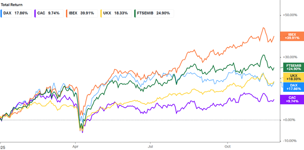 Európske akciové indexy ukázali rast okolo percenta – STOXX 600 +0,91 %; DAX 40 +0,97 %; FTSE 100 +0,78 %; CAC 40 +0,83 %; FTSE MIB +0,95 %; IBEX 35 +1,08 %.