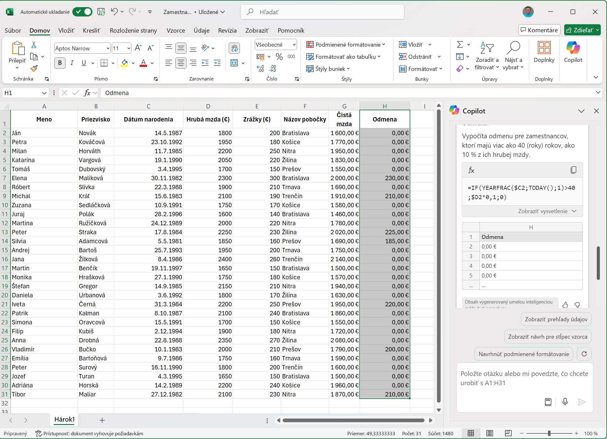 V tomto prípade sa Copilot nevyznamenal. Výstup totiž neobsahuje informáciu o podmienke, že odmena sa počíta len pre ľudí starších ako 40 rokov. Citujeme: Vzorec v bunke H9 je: =G9 + 0,1 * G9 Tento vzorec vypočíta hodnotu v bunke H9 takto: Vezme hodnotu v bunke G9 (čistá mzda). Pridá 10 % z tejto hodnoty (0.1 * G9). Výsledkom je čistá mzda zvýšená o 10 %.