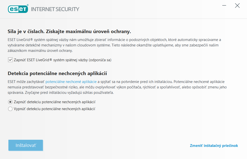 V inštalačnom dialógu budete môcť aktivovať aj detekciu potenciálne nechcených aplikácií. Ak sa nejaká aplikácia či doplnok idú inštalovať, ESET Internet Security sa vždy opýta, či používateľ naozaj súhlasí s ich inštaláciou do prehliadača. Často totiž pri inštalácii iných aplikácií, ktoré chcete, ponecháte zaškrtnuté aj políčko typu „a ešte nainštalujem aj ...“. Takéto aplikácie a doplnky nemusia predstavovať bezpečnostné riziko, no môžu ovplyvňovať rýchlosť počítača, prípadne ak sa nainštalujú do prehliadača, môžu dizajnom predstierať, že ide o populárny vyhľadávač, a ponúkať vám marketingovo prispôsobené výsledky vyhľadávania. Možno poznáte situáciu, keď do vyhľadávača zadáte všeobecnú frázu, napríklad „činnosť štvortaktného motora“, a doplnok maskovaný za vyhľadávač vám vráti odpovede typu: Najlacnejší štvortaktný motor kúpite na supernajobchod.sk.