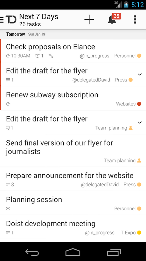 Táto aplikácia je populárna a mnohí ju hodnotia ako „aplikáciu, ktorá mení životy“. Ide o pomerne jednoduchý organizačný systém, založený na zoznamoch toho, čo máte vykonať. Používajú ho viac ako 4 milióny ľudí po celom svete, existuje na pätnástich rôznych platformách a disponuje dvadsiatimi jazykovými mutáciami. Organizovať svoj čas môžete aj bez pripojenia k internetu. Položky vo vašich zoznamoch môžete opatriť termínmi a prideľovať im rôzne priority, všetko s podporou funkcie drag-and-drop. Ak vám nestačí jednoduchosť, môžete vytvárať podúlohy, podprojekty, rozdelené farebne i stupňom dôležitosti. Nájdete tu funkcie, ktoré vyhovujú súkromnému aj podnikovému prostrediu. Napríklad môžete zdieľať projekty, prideľovať úlohy a komentovať priamo v aplikácii. Systém notifikácií je samozrejmosť. Naopak, špecialita je tzv. systém Todoist Karma, určený nepoučiteľným prokrastinantom. Ak často odkladáte úlohy a neplníte termíny, pomocou zbierania bodov a prehliadania štatistík si môžete monitorovať svoju aktivitu či pasivitu. Todoist podporuje i množstvo aplikácií, ako Google Drive, Cloud Magic, Sunrise Calendar a množstvo ďalších. Za zmienku stojí i prepojenie s Google Now, DashClock a zariadeniami s Android Wear. Platená verzia ponúka napríklad notifikáciu založenú na vašej aktuálnej polohe, nahrávanie súborov, obrázkov či zvuku.