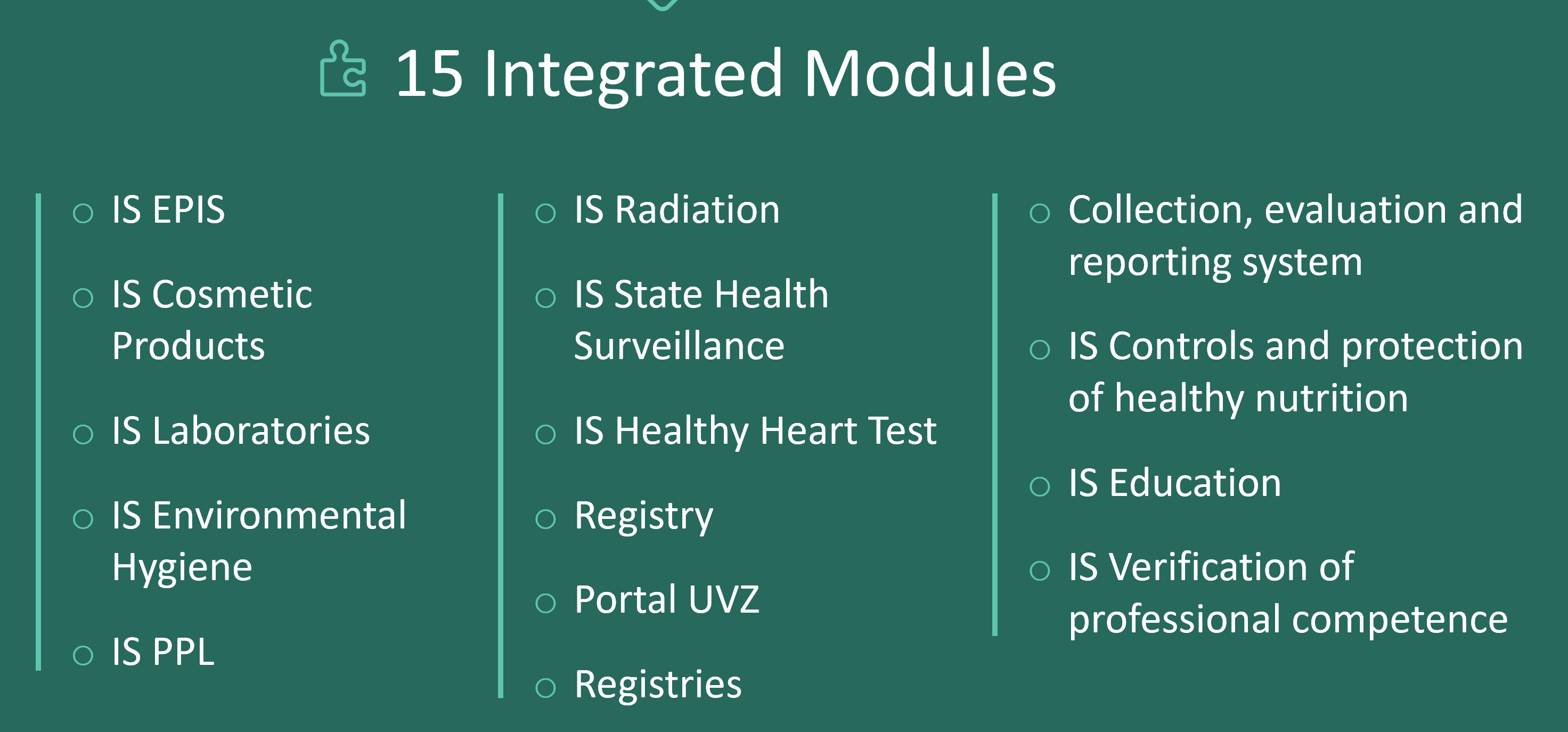 Nový cloudový systém má 15 integrovaných modulov pokrývajúcich všetky aspekty verejného zdravotníctva vrátane epidemiológie, štátneho zdravotného dozoru, radiačnej ochrany, kontroly a ochrany zdravej výživy, overovania odbornej spôsobilosti, kozmetických výrobkov, hygieny životného prostredia a ďalších. Systém umožňuje nahlasovať zdroje ionizujúceho žiarenia, evidovať stavebné materiály, ktoré môže obsahovať stopy rádioaktivity a podobne. Toto všetko je sú procesy, ktoré sú elektronizované v rámci tohto systému. Systém sa využíva na všetkých 36-tich regionálnych úradoch verejného zdravotníctva.