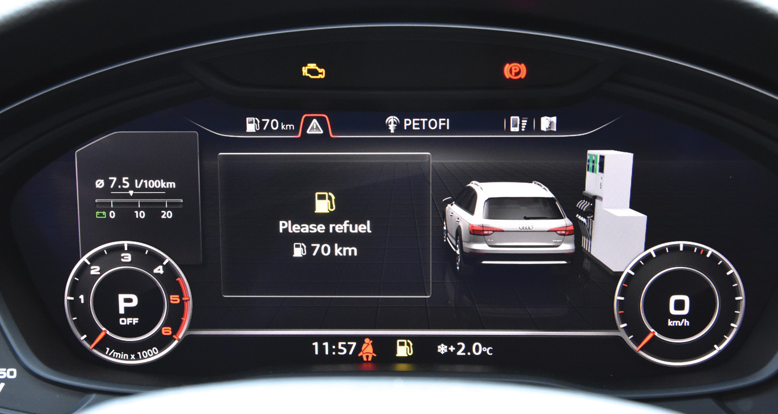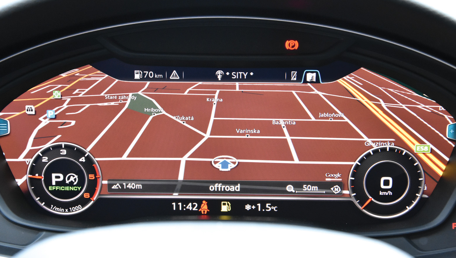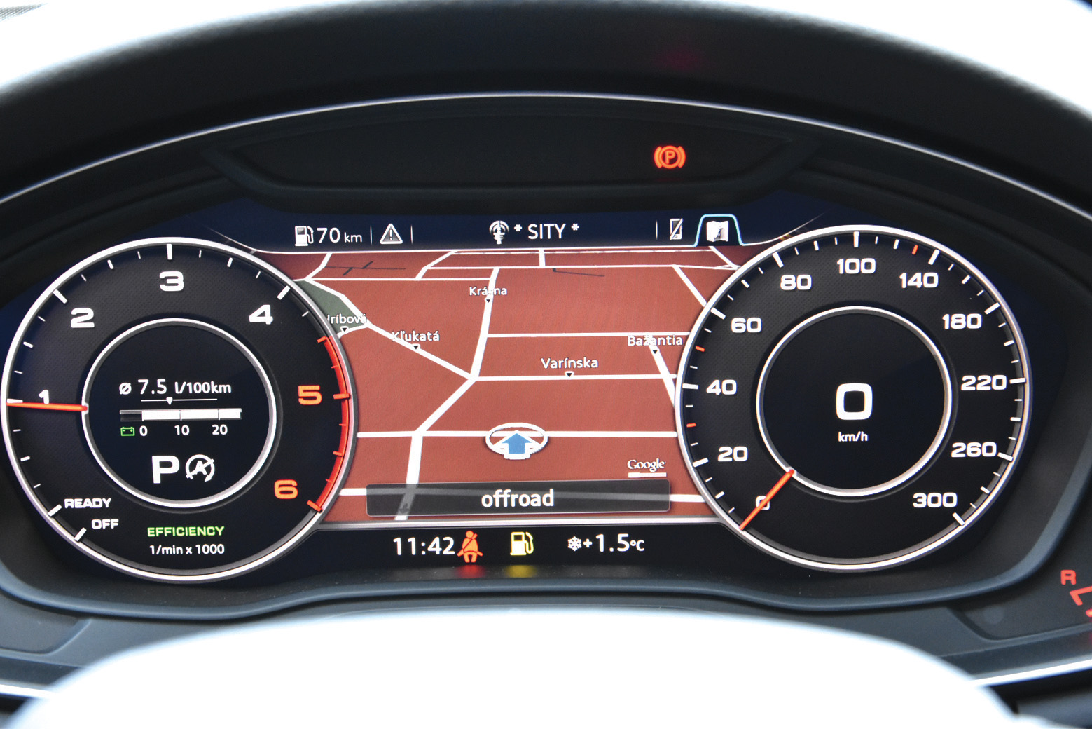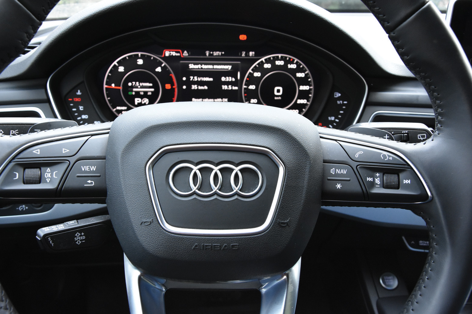 Trojramenný multifunkčný športový kožený volant s vyhrievaným vencom výborne sadne do rúk, všetky ovládacie prvky sú logicky usporiadané a ľahko dostupné. Radosť ho držať v rukách. Veľmi sa nám páčil aj 12,3-palcový virtuálny prístrojový panel Audi virtual cockpit. Kvalita obrazu bola aj vďaka vysokému kontrastu výborná, grafika a význam informačných prvkov na „budíkoch“ je logická, jasná a prehľadná. K dispozícii je možnosť zobraziť na paneli medzi otáčkomerom a tachometrom aj doplnkové informácie, napr. mapu navigácie, pričom v prípade potreby je možnosť zmenšiť ich rozmery a dať viac priestoru navigačnej mape.