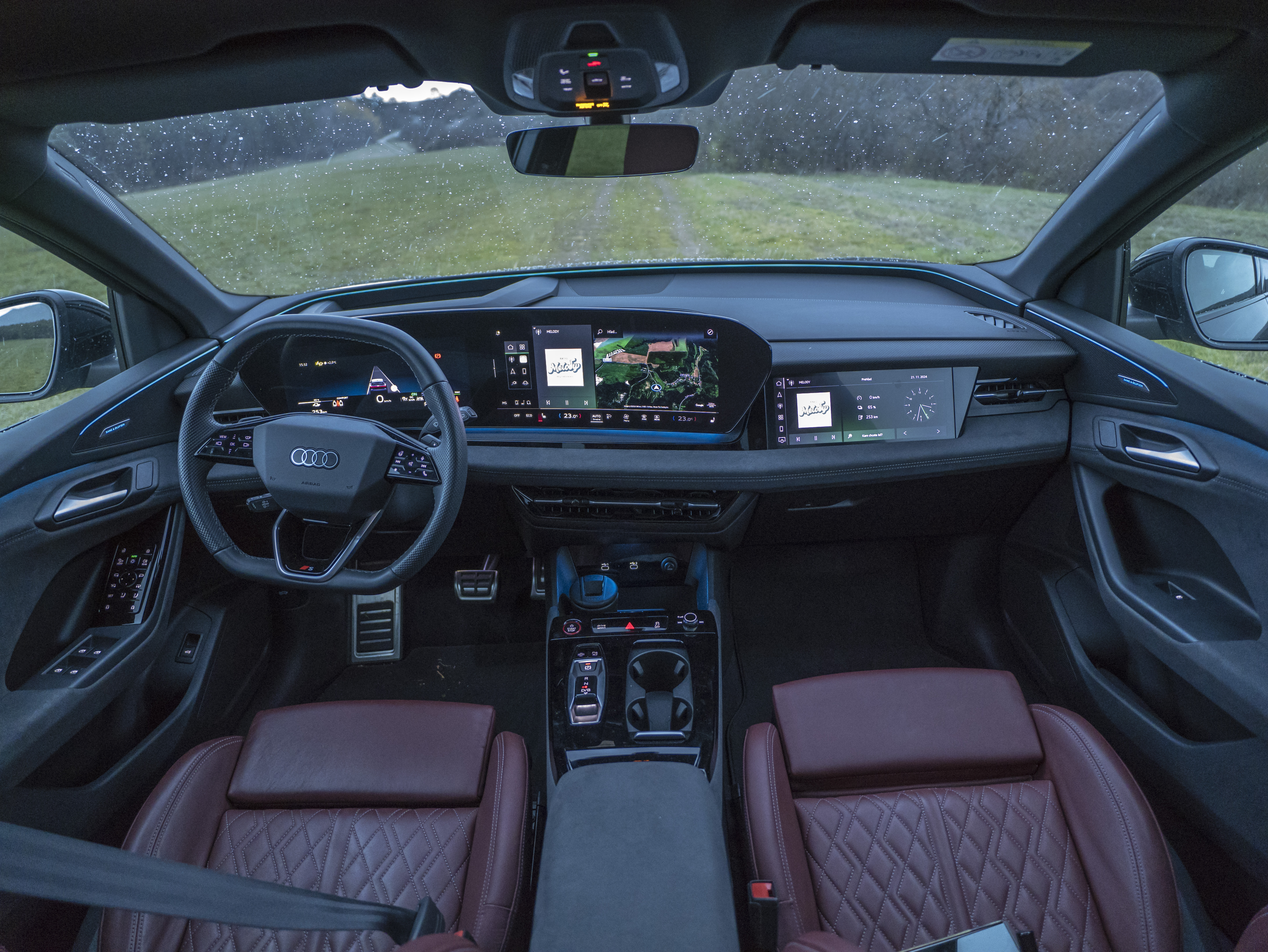 V kabíne zaujme nový displej MMI s uhlopriečkou 14,5 palca a 11,9-palcový virtuálny kokpit Audi. Tie sú súčasťou panoramatického dotykového systému MMI orientovaného na vodiča. Ten umožňuje jednoduché a intuitívne ovládanie všetkých funkcií vozidla. Žiaľ, hlavne potenciál displeja prístrojového panela nie je veľmi využitý. Umožňuje iba dva typy zobrazenia s ukazovateľom asistenčných systémov uprostred. Oproti starším systémom si tu však už iný pohľad neviete dať. Hodil by sa aj nejaký ukazovateľ výkonu, respektíve toku výkonu počas jazdy a podobne. Pre spolujazdca je k dispozícii ďalší 10,9-palcový dotykový displej, ktorý umožňuje ovládanie multimediálnych funkcií a navigácie bez toho, aby rušil vodiča. Počas jazdy sa jeho povrch pre vodiča elektronicky zatemní, sledovať ho môže iba spolujazdec. Ten si okrem sledovania trasy alebo ovládania multimédií môže pozerať videá alebo hrať hry. Žiaľ, displej neumožňuje separátne pripojenie napríklad slúchadiel, aby spolujazdec nerušil iných. Vo výbave sme mali aj nový head-up displej s rozšírenou realitou, po novom zobrazujúci aj grafiku radaru, podľa ktorej vidíte, ktorý objekt pred vami sleduje. Efektne je urobené zobrazenie zmeny rýchlostného limitu, keď vám značka s novým limitom akoby priletela z diaľky. Head-up displej patrí vďaka rozšírenej realite k najlepším v súčasných modeloch vozidiel.