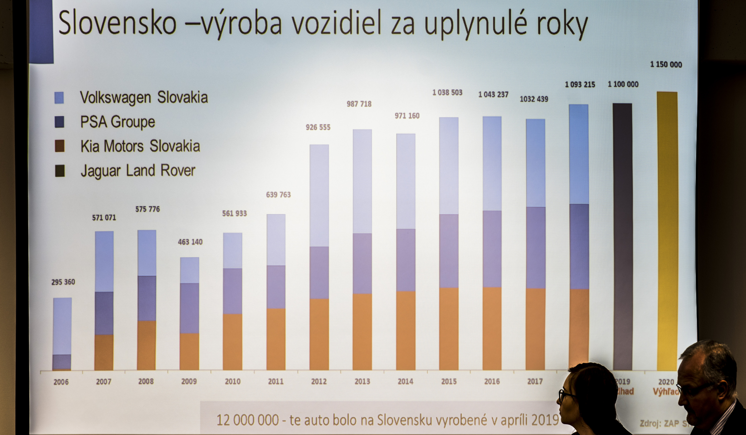 Zväz automobilového priemyslu SR na tlačovej konferencii zverejnil predbežné výsledky výroby áut na Slovensku za uplynulý rok. Vyplýva z nich že sa na Slovensku v minulom roku vyrobilo viac ako 1 100 000 vozidiel, čo je v porovnaní s rokom 2018 mierny nárast. Vďaka týmto výsledkom zostáva Slovensko aj naďalej svetovým lídrom v počte vyrobených automobilov s hodnotou 202 osobných áut na 1000 obyvateľov.