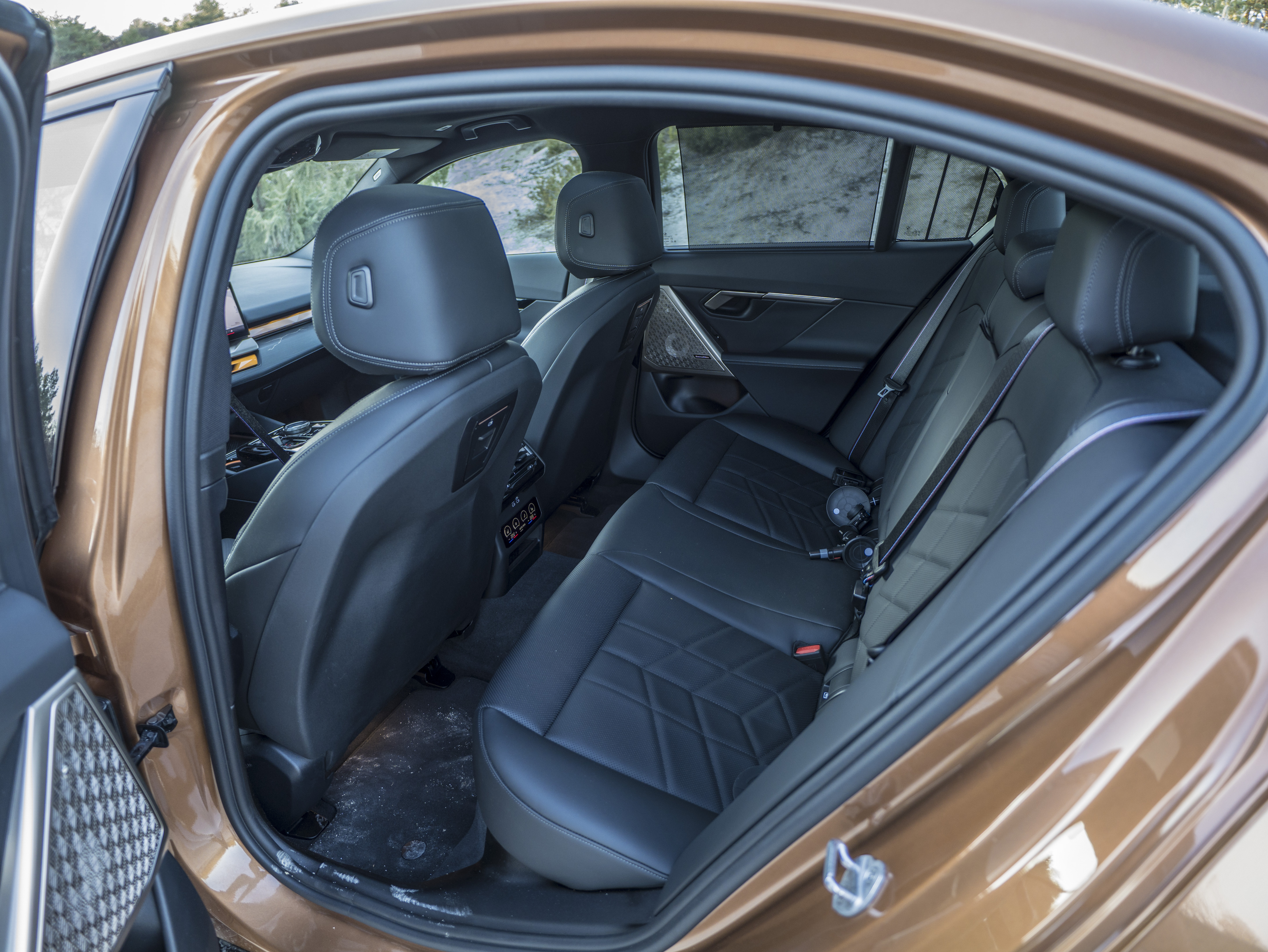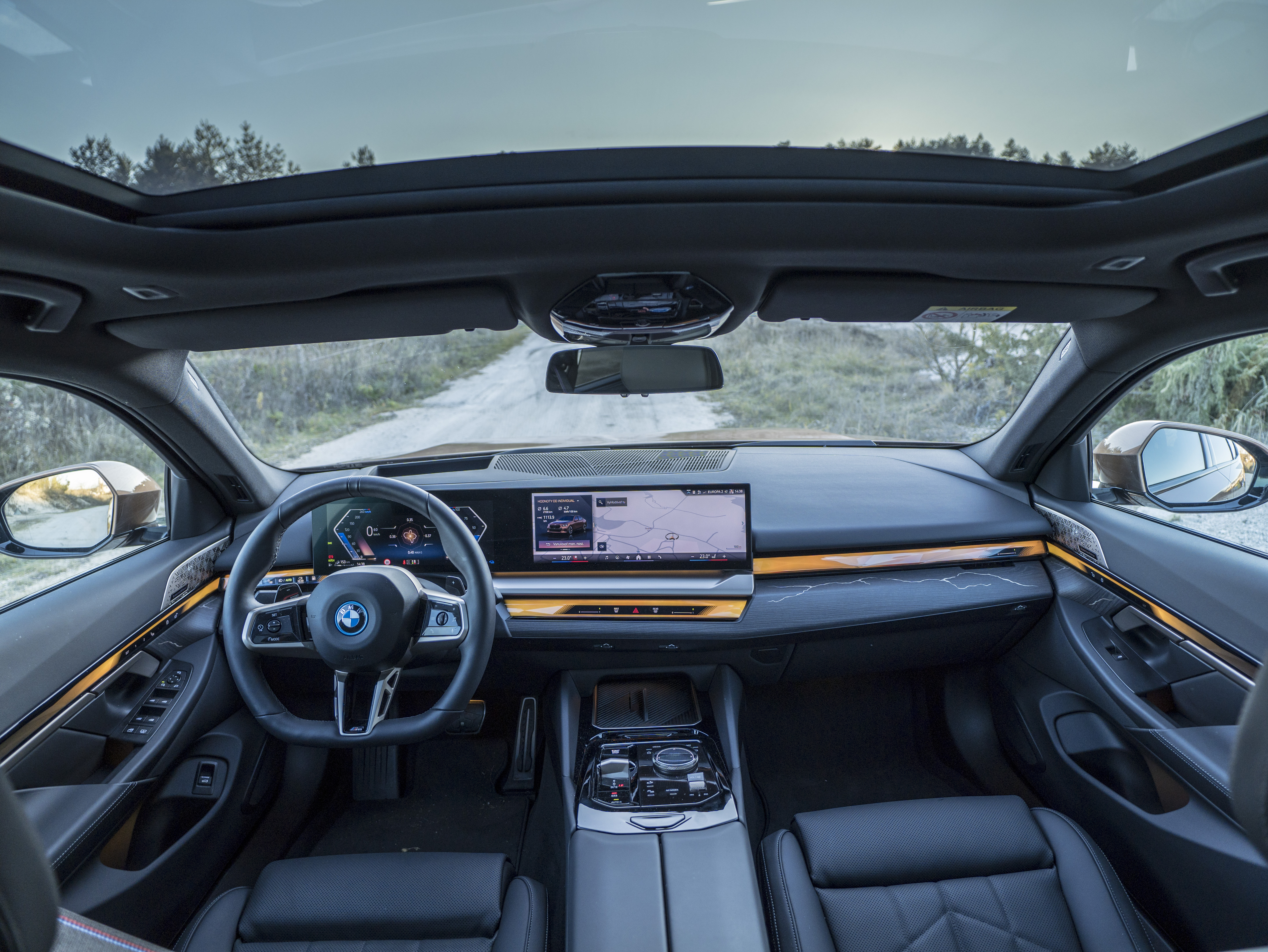 Prednej časti dominuje modernizovaná interpretácia dvojitých svetlometov a „obličiek“ masky chladiča. Smerovky a denné svetlá sú riešené takmer vertikálne usporiadanými LED prvkami. Obličky masky chladiča, ktoré vyčnievajú ďaleko dopredu, dostali široký rám a voliteľne dodávané obrysové osvetlenie BMW Iconic Glow, ktoré bolo aj súčasťou našej výbavy. Pri výbere farieb sú už pri uvedení na trh k dispozícii aj tri laky z ponuky BMW Individual. Testované vozidlo bolo v jednej z týchto farieb, nazvanej Liquid Copper. Nádherná medená metalíza s čiernymi doplnkami vozidlu sekne, a kam sme sa s ním pohli, bolo stredobodom pozornosti. Prémiový exteriér vhodne dopĺňa špičkovo spracovaná kabína s exkluzívnym ambientným podsvietením s ovládacou lištou BMW Interaction Bar a nápaditými kombináciami materiálov, ako napríklad drevo so striebornými doplnkami. V kabíne je v porovnaní s predchádzajúcou generáciou výrazne nižší počet tlačidiel a ovládacích prvkov. Zakrivený displej BMW Curved Display je zameraný na vodiča a pod jedným sklom ukrýva 12,3" displej prístrojovej dosky a 14,9" stredový displej. Nový je aj volant so sploštenou spodnou časťou a haptickou reakciou na ovládacích paneloch, ako aj páka voliča režimov jazdy na stredovej konzole. Nový BMW radu 5 Sedan je prvé vozidlo značky, ktoré sa štandardne dodáva s úplne vegánskym interiérom. To zahŕňa poťahy sedadiel, palubnej dosky, výplne dverí a prvýkrát aj volant.