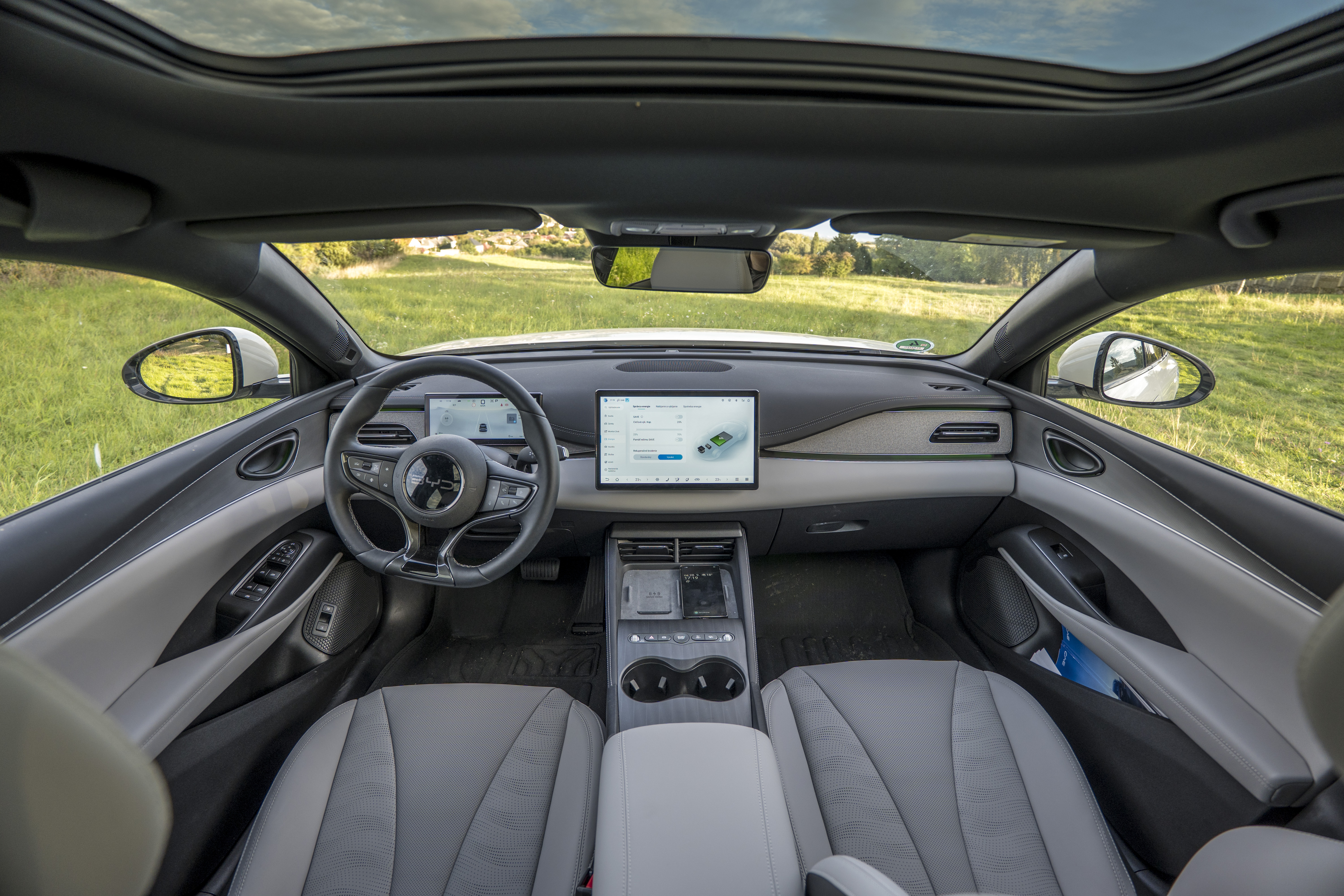 Interiér modelu Seal 6 DM-i vychádza z ostatných modelov BYD s plynulým dizajnom palubnej dosky, ktorému dominuje veľký 12,8-palcový dotykový displej, tentoraz však už bez otáčania. Displej prístrojového panela je podobný ako na iných čínskych modeloch a podobne je to aj s jeho zobrazením. To má iba jednoduchú grafiku s množstvom maličkých ikoniek a horšie čitateľných informácií. Podobne je to aj pri hlavnom displeji. Našťastie je tu Android Auto, ktoré funguje bezdrôtovo a veľmi dobre. Jediný problém je, že sa natiahne na celú obrazovku a prekrýva aj ovládanie klimatizácie, takže ho musíte sťahovať do lišty. Na rozdiel od viacerých čínskych konkurentov je tu predsa len viac fyzických ovládačov, aj keď klimatizáciu stále ovládate iba cez displej. Trojprstové potiahnutie po obrazovke vo vertikálnom alebo horizontálnom smere na nastavenie teploty a rýchlosti ventilátora funguje v praxi dobre, musíte však o ňom vedieť, takže za intuitívne sa to označiť nedá. Kvalita materiálov je uspokojivá, syntetická koža a mäkké obklady na palubnej doske pôsobia príjemne, aj keď kvalita plastov okolo stredovej konzoly sa môže zdať horšia. Vzadu majú cestujúci k dispozícii veľkorysý priestor na kolená. Tento priestor kompenzuje fakt, že priestor nad hlavou je len priemerný, a nízka základňa sedadla vzhľadom na podlahu znamená, že podpora pod stehnami nie je najlepšia. Batožinový priestor s objemom 675 litrov je konkurencieschopný, s možnosťou rozšírenia na 1535 litrov po sklopení zadných sedadiel.