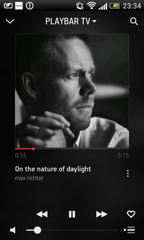 Špecifická vlastnosť optického výstupu v TV je tá, že nie je regulovaný. To znamená, že aj keď stíšite TV, externá reprosústava pripojená cez optiku bude hrať stále rovnako. SONOS to vyriešil jednoducho. Výhodou Playbaru je IR senzor, vďaka ktorému môžete ovládať hlasitosť aj bežným diaľkovým ovládačom televízora. Aktivácia tejto funkcie je otázka niekoľkých sekúnd. Stačí v ovládacom softvéri SONOS Controller zvoliť konfiguráciu a v príslušnej chvíli namieriť ovládač na Playbar a na 2 sekundy stlačiť tlačidlo na zvýšenie hlasitosti. Playbar si z ovládača načíta kódovanie a celý proces je ukončený. Ako zázrakom začne Playbar reagovať na povely regulácie hlasitosti, ale aj na tlačidlo MUTE.