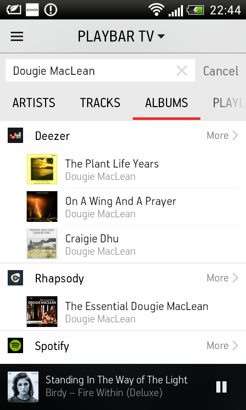 Milovníci hudby, ktorí radi počúvajú internetové rádiá alebo majú predplatené rôzne služby, ako Deezer, Last.fm a podobne, budú zo SONOSu nadšení. Najmä zo šikovnej integrácie všetkých hudobných služieb do jedného spoločného prehrávača. Stačí zadať do vyhľadávača názov skladby alebo meno interpreta a vzápätí máte pred sebou výsledky zo všetkých služieb, ba dokonca z vlastnej hudobnej knižnice z NAS-u. Pre úplnosť dodáme, že kúpou systému SONOS nedostávate automaticky zadarmo žiadny bezplatný prístup k plateným službám.