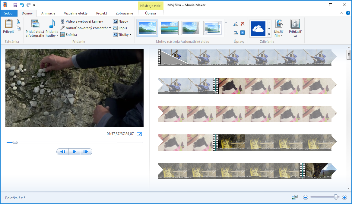 Používanie Movie Makera je pomerne jednoduché a zvládne ho aj úplný začiatočník. Rozhranie s typickým pásom nástrojov je dnes už dobre známe a navyše je program aj kompletne v slovenčine. Na úvod stačí video pretiahnuť do okna programu alebo ho vložiť cez tlačidlo Pridať videá a fotografie. Na pás videa, usporiadaný trochu menej štandardne do zalomených riadkov, môžete klikať a pravým tlačidlom myši (prípadne na páse Úprava) vkladať strihy. Približovanie náhľadu vám pomôže strihať v presnom čase. Postrihané kúsky môžete vymazávať, preskupovať či do nich vkladať úseky iného videa alebo statické obrázky. Program podporuje niekoľko základných prechodov medzi strihmi a takisto mixovanie zvukových stôp v podobe pridávaného komentára či hudby. Podporuje takisto základné vkladanie textu a miernu úpravu videa v podobe zmeny jasu a aplikovania niekoľkých farebných filtrov, rovnako aj aplikovanie stabilizácie obrazu. Hotové video sa dá ukladať na disk (MPEG-4/H.264) a takisto ho priamo z programu môžete uploadovať na cloudové úložisko a sociálne siete.