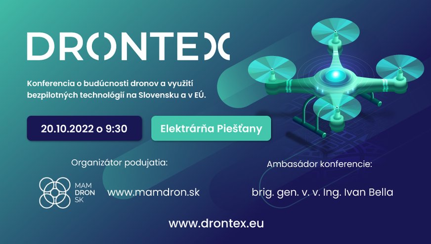 20.Októbra 2022 sa v Piešťanoch uskutoční prvý ročník odbornej konferencie zameranej na drony a ich využitie v priemysle a službách – DRONTEX 2022. Podujatie s medzinárodným presahom ponúkne zaujímavý program a prezentácie odborníkov na bezpilotné technológie, ako aj prípadové štúdie využitia dronov v poľnohospodárstve, kartografii, či energetike.
