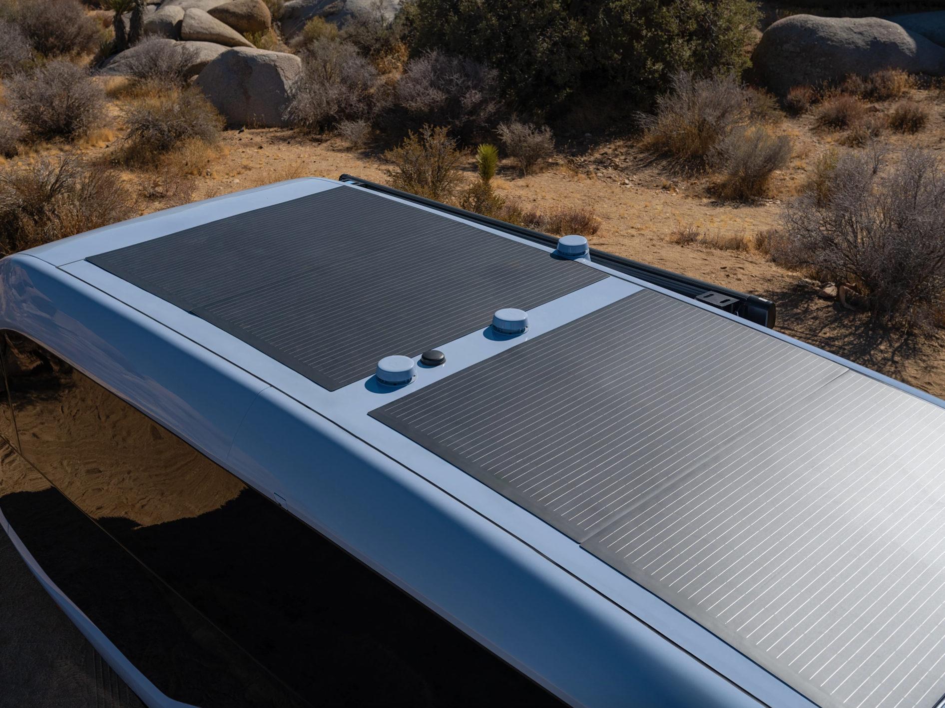 Pebble Flow je plne elektrický ekosystém navrhnutý pre maximálnu slobodu a nezávislosť od civilizácie. Základom je batéria typu LFP (lítium-železo-fosfát) s kapacitou 45 kWh, ktorá napája všetky systémy na palube a úplne eliminuje potrebu hlučných generátorov či propánových fliaš. Strechu pokrýva solárny panel s výkonom 1,1 kW, ktorý dokáže dobíjať batériu a zabezpečiť energiu až na sedem dní pobytu mimo elektrickej siete.