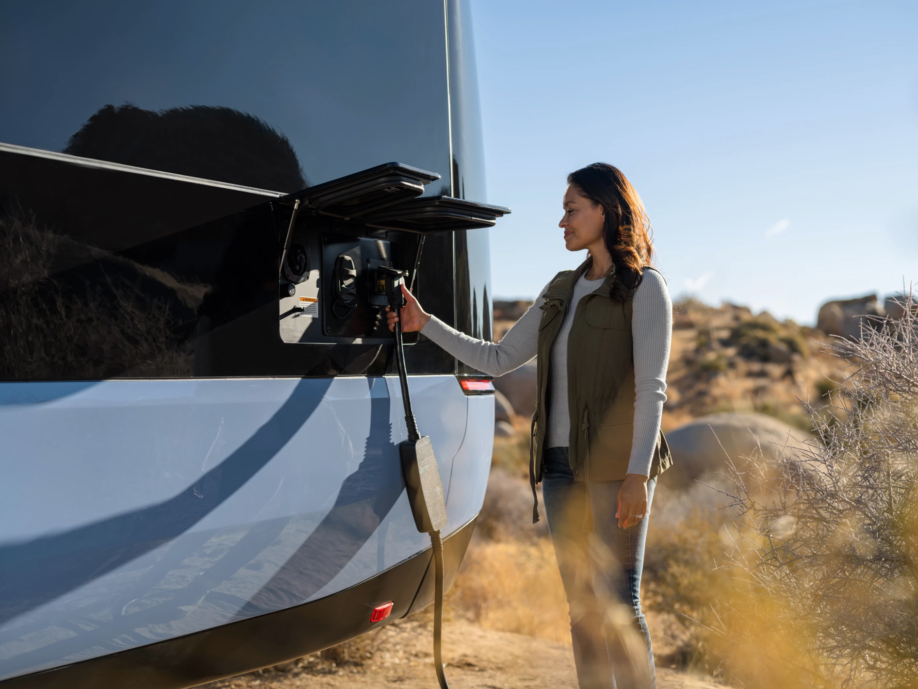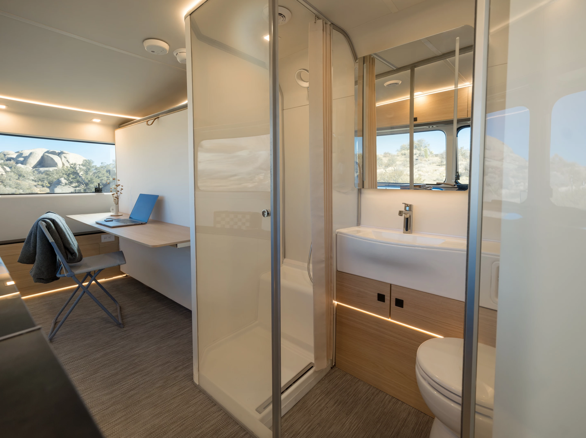 Priestor je určený pre štyri osoby, pričom predné sedenie sa dá premeniť na dvojlôžko a v zadnej časti sa nachádza sklopná posteľ, ktorá cez deň uvoľní miesto pre pracovný kútik. Kuchyňa je vybavená vyberateľnou indukčnou varnou doskou na vnútorné aj vonkajšie použitie, chladničkou s objemom 184 litrov, mrazničkou s objemom 42 litrov a konvekčnou mikrovlnnou rúrou 4 v 1. Kúpeľňa disponuje inteligentným sklom, ktoré sa na dotyk zmení z priehľadného na nepriehľadné. Samozrejmosťou je integrované pripojenie na Starlink.