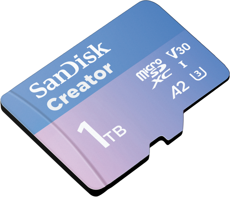- Karta SanDisk Creator microSD™: vďaka dostupnej kapacite až 1 TB1 môžu tvorcovia bez námahy zachytávať úžasné zábery v rozlíšení 4K5 a 5K5 profesionálnym výkonom a prenášať súbory rýchlosťou turbo pomocou čítačky kariet SanDisk QuickFlow™ microSD UHS-I USB-A (predáva sa samostatne).