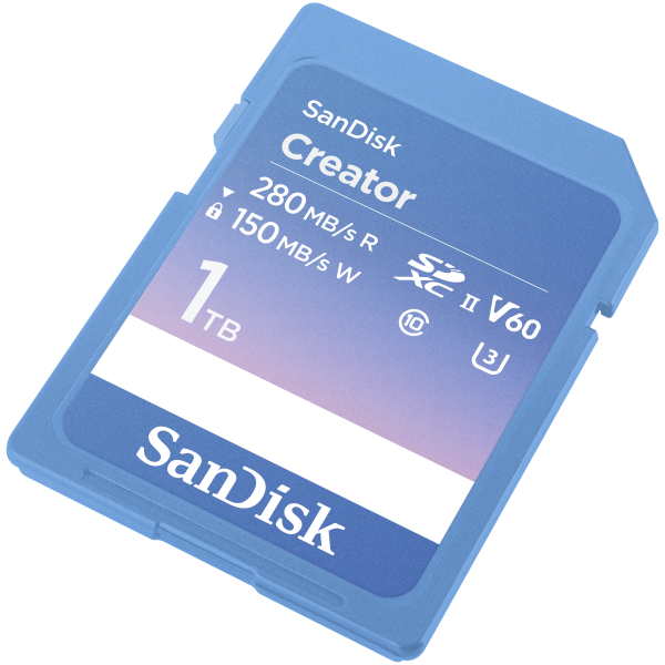 - Pamäťová karta SanDisk Creator SD UHS-II: Táto vysoko výkonná pamäťová karta je k dispozícii v kapacitách až do 1 TB1 a je určená pre tvorcov, ktorí vyžadujú profesionálnu kvalitu záznamu obrázkov a videí s výnimočnou spoľahlivosťou na bezproblémové snímanie, úpravu a publikovanie príspevkov na webe.