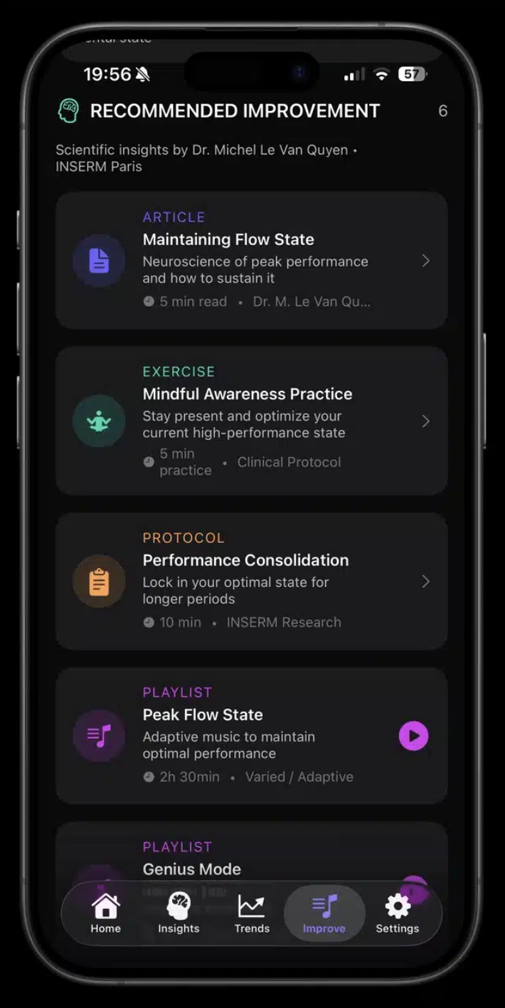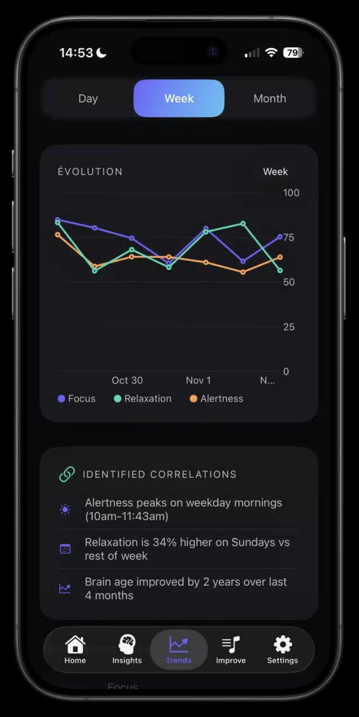Slúchadlá počas dňa pasívne monitorujú úroveň sústredenia, stresu a mentálnej únavy. Používateľ prostredníctvom aplikácie získa prehľad o tom, kedy je jeho mozog najvýkonnejší a kedy naopak potrebuje prestávku na regeneráciu. Jednou z kľúčových funkcií je pokročilé monitorovanie spánku, ktoré presahuje možnosti bežných inteligentných hodiniek.