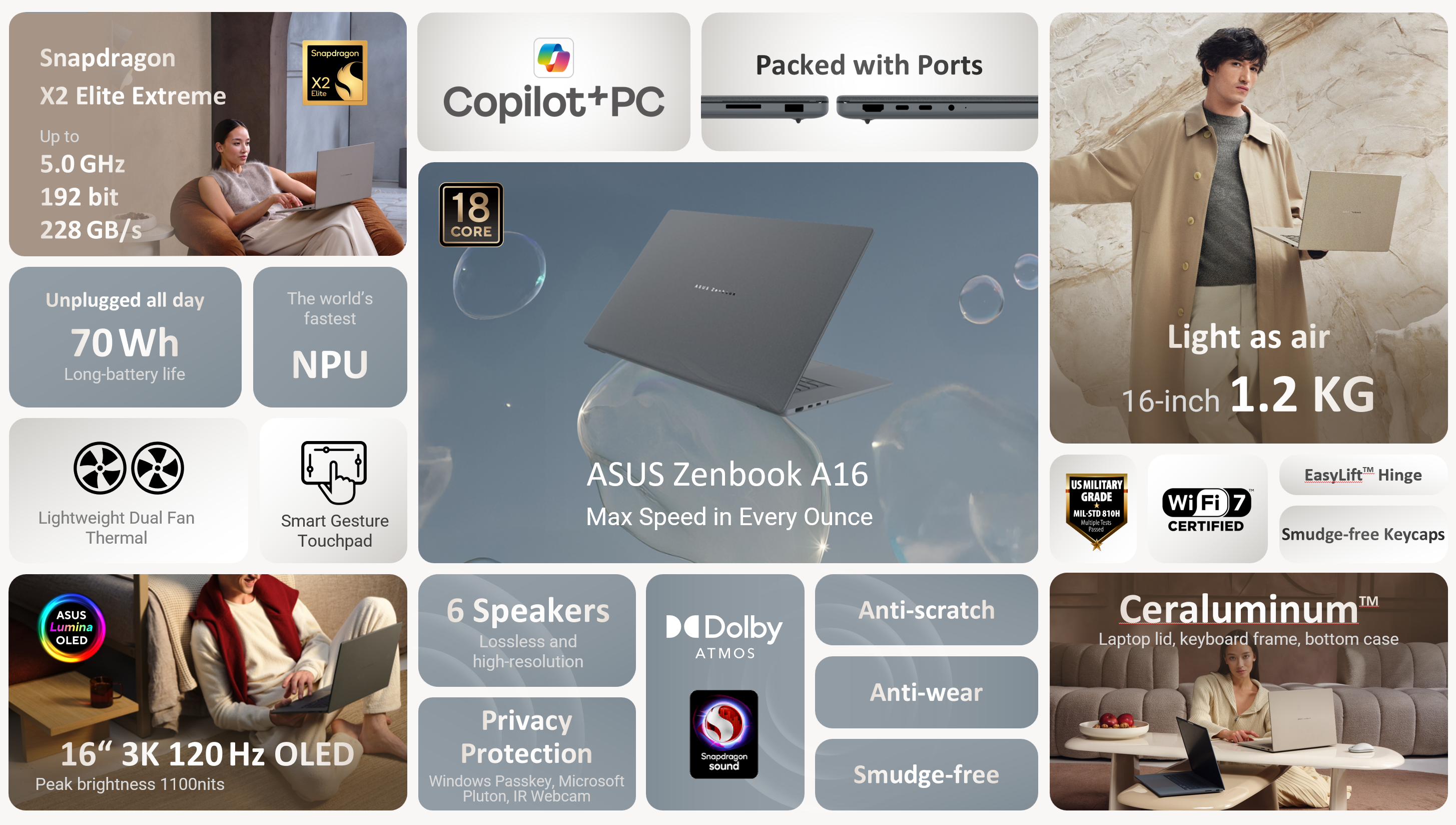 Vďaka 18-jadrovému procesoru Snapdragon X2 Elite Extreme s NPU jednotkou s výkonom 80 TOPS ide o najrýchlejší a najvýkonnejší notebook s čipom Snapdragon. Zariadenie naplno využíva lokálne AI funkcie a vysokú energetickú efektivitu, čo umožňuje viacdňovú výdrž batérie pre neprerušovanú produktivitu. Veko, rám klávesnice aj spodná časť sú vyrobené z materiálu Ceraluminum, exkluzívneho riešenia spoločnosti ASUS, ktoré ponúka výnimočnú odolnosť, rezistenciu voči opotrebovaniu a ochranu proti poškriabaniu. Povrch je zároveň vybavený technológiou Smudge-Free, pokročilou viacvrstvovou úpravou spoločnosti ASUS, ktorá minimalizuje odtlačky prstov a nečistoty, pričom zachováva čistý vzhľad, prémiový pocit a dlhodobú odolnosť. Vďaka profesionálnemu grafickému výkonu môžete na tomto ultraľahkom notebooku, zameranom na maximálny výkon, kdekoľvek bez obmedzení tvoriť, hrať aj pracovať.