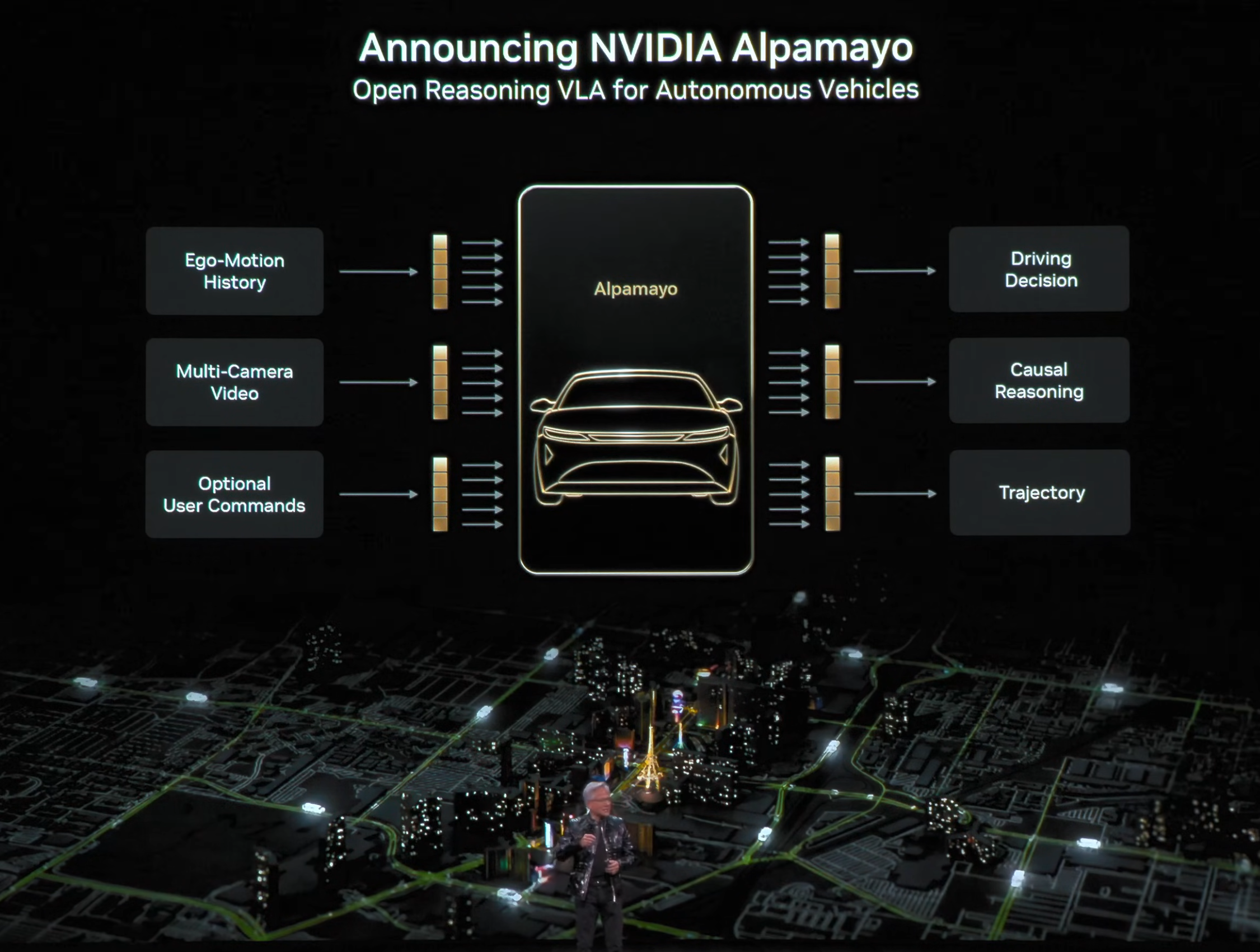 NVIDIA Alpamayo je AI platforma pre autonómne autá. Prijíma vstupy z kamier a senzorov a aktivuje volant, brzdy a zrýchľovanie, ale tiež rozhoduje o tom, akú akciu sa chystá vykonať. Povie vám, akú akciu vykoná, dôvody, prečo k tejto akcii došlo, a potom samozrejme trajektóriu. Predpokladá sa, že prvé auto s autonómnym systémom od NVIDIA bude na cestách v prvom štvrťroku v USA a potom pôjde do Európy v druhom štvrťroku a do Ázie v treťom a štvrtom štvrťroku. Samozrejme AI bude priebežne aktualizovaná. Najskôr bude implementovaná vo vozidle Mercedes-Benz CLA.