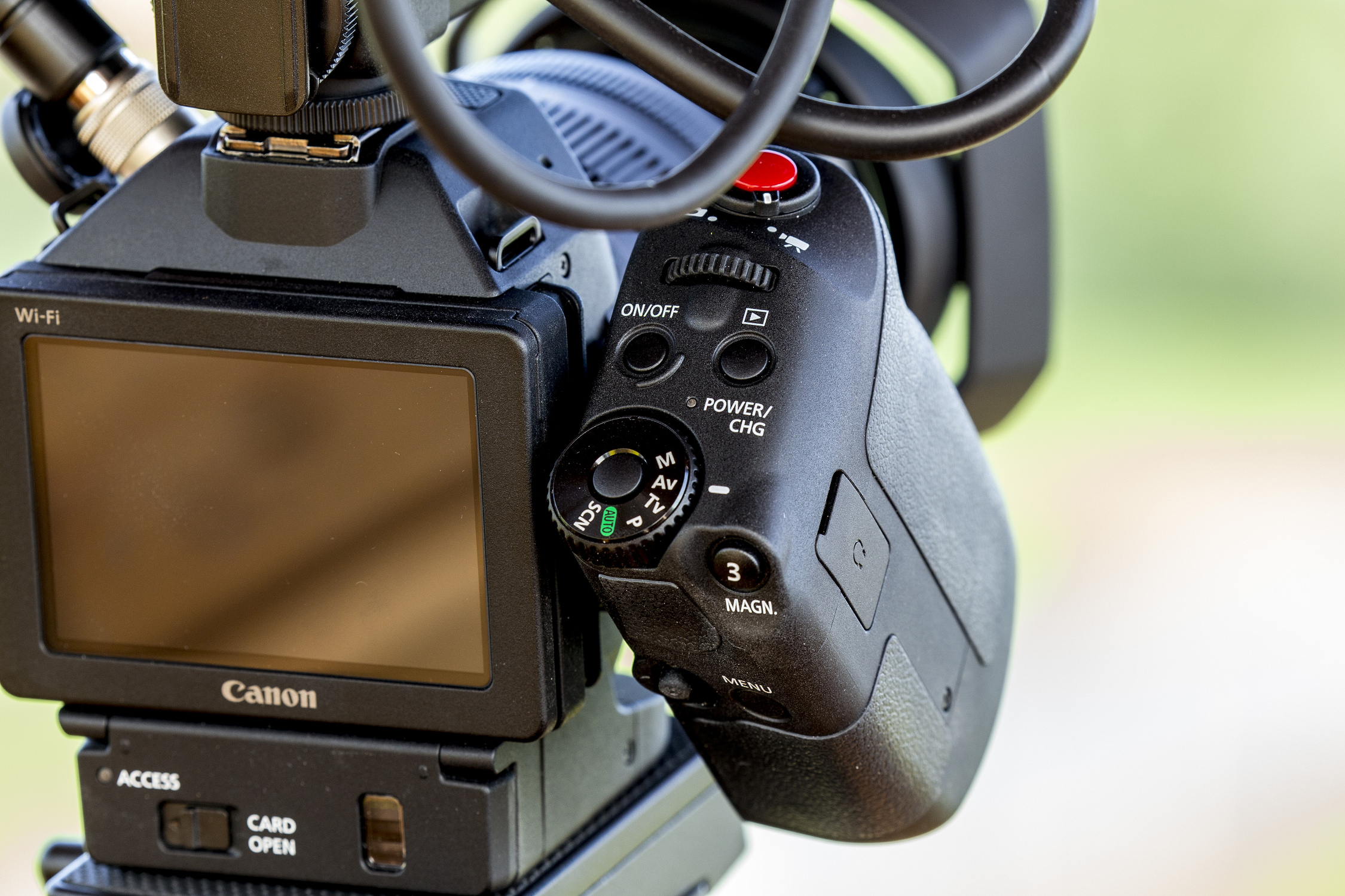 Ovládanie audiovstupov je však vďaka tomu trochu prekombinované, a aj keď máte pripojený modul, musíte niektoré veci konfigurovať cez menu. Ľavá zadná hrana nesie úzky výduch ventilátora (ten je v prípade potreby vypínateľný). Trojpalcový dotykový displej, umiestnený na zadnej stene, možno naklápať smerom hore aj dole, takže umožňuje kontrolu záberu v každej situácii. Užitočná zaujímavosť, ktorú sme videli už pri XC10, je hľadáčikový nadstavec na displej, ktorý umožňuje použitie kamery aj za silného svetla (kamera nemá samostatný hľadáčik). Pravda je, že sme tajne dúfali, že výrobca použije vyššie rozlíšenie displeja, aby práve pri použití v role hľadáčika bolo možné zmenšiť používané piktogramy. Trochu nepríjemné je, že v tomto režime prídete o možnosť dotykového ovládania, týka sa to hlavne zaostrovacieho bodu. Ostatné sa dá nahradiť joystickom. Nadstavec sa na displej pripevňuje jednoduchým zaklápacím mechanizmom, takže ho možno v prípade potreby rýchlo demontovať. Pod displejom sú umiestnené ešte dvierka šachiet na pamäťové karty SDXC a CFast. Pravej strane dominuje rukoväť, ktorú možno oproti telu otočiť o 90° dopredu aj dozadu, čo umožňuje jednoduchšie držanie aj pri extrémnych podhľadoch alebo nadhľadoch. V tej je zo spodnej strany umiestnený akumulátor, zozadu tlačidlo menu a ovládací joystick s potvrdzovaním. V pravom hornom rohu je tretie programovateľné tlačidlo v základnom nastavení, priradené ostriacemu asistentovi. Na vrchnej časti je prepínacie koliesko prevádzkových režimov s aretáciou, tlačidlo zapnutia/vypnutia, prehrávania, otočný volič a tlačidlo záznamu s prepínačom foto/video. Na prednej strane rukoväti dole je umiestnená kontrolka záznamu a prijímač IR DO. Diaľkový ovládač možno dokúpiť.