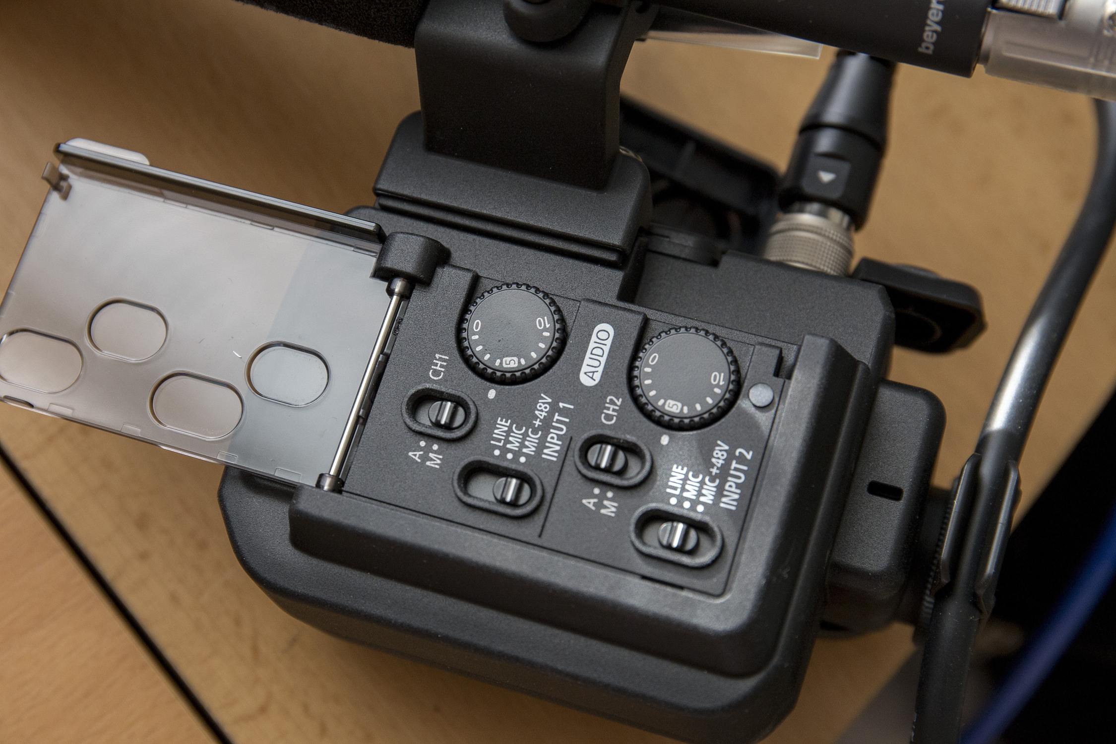 Aj keď výrobca mlčí o spôsobe, ako to dosahuje, odhadujeme, že pravdepodobne používa viacnásobný odpočet snímača vyššou frekvenciou a vďaka tomu sa darí účinne potláčať šum. Trojici programovateľných tlačidiel môžete priradiť funkcie podľa vašich preferencií. Ovládanie zoomu je iba manuálne, je však úplne mechanické, takže reaguje okamžite s pohybom krúžku. Oba krúžky objektívu sú vybavené drážkami na pripojenie externej ovládacej mechaniky. Zvuk sa dá nastavovať ručne cez menu alebo použiť niektorý z prednastavených zvukových programov. Prídavný zvukový modul umožňuje pripojenie dvojice mikrofónov alebo vstupov cez konektory XLR. Oba zvuky môžete nahrávať zvlášť, prípadne ak používate reportážny mikrofón, môžete zvuk presmerovať do oboch kanálov. Súčasne možno pripojiť aj mikrofón k 3,5 mm jacku, aktívny však môže byť buď ten, alebo vstup z prídavného modulu. Na rukoväti je k dispozícii aj výstup na slúchadlá. Záznam zvuku je veľmi kvalitný a vďaka možnosti manuálneho nastavenia môžete veľmi dobre eliminovať ruchy. V tichom prostredí možno dočasne vypnúť aj vstavaný ventilátor, treba však dať pozor, aby sa kamera neprehrievala.