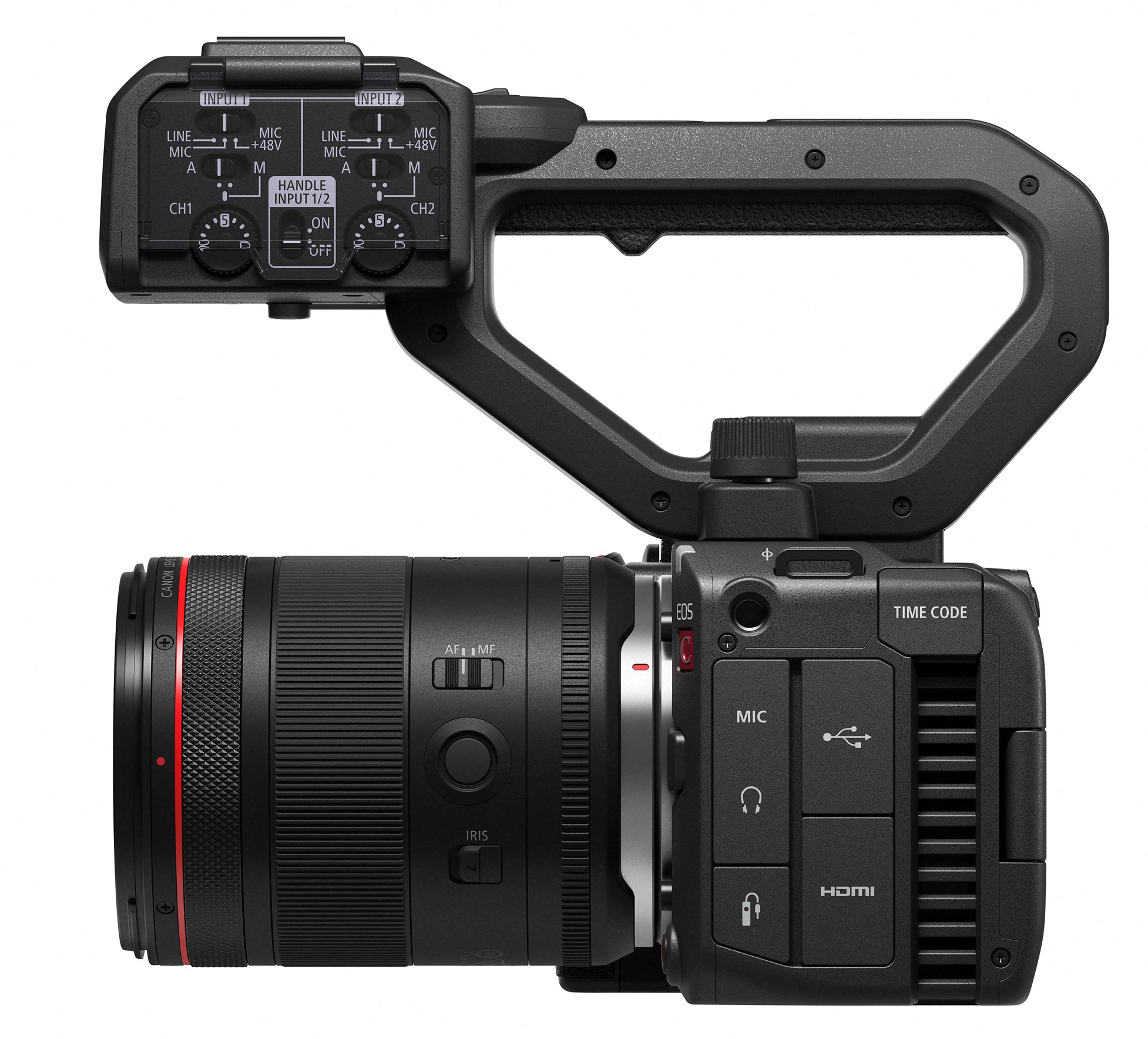 Odnímateľná rukoväť EOS C50 zlepšuje ovládanie a užívateľský komfort. Kamera je vybavená dvoma 3-kolíkovými zvukovými konektormi XLR plnej veľkosti a otočnými potenciometrami na záznam zvuku v profesionálnej kvalite. Je tu tiež tlačidlo REC pre záznam a kolískové ovládanie transfokácie pre pohodlnú prácu s kamerou v situáciách, kde hrá rolu pohotovosť a rýchlosť.