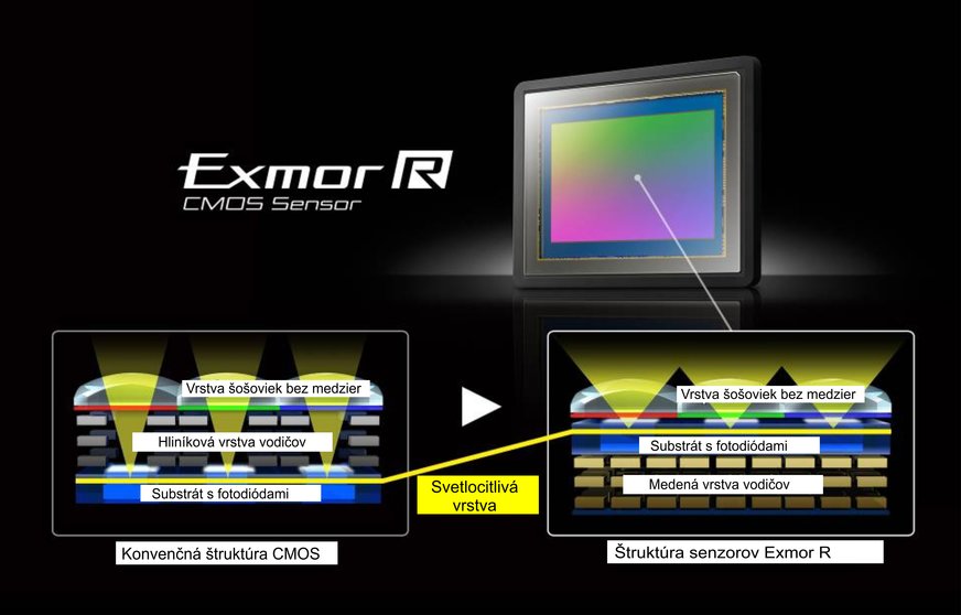 Porovnanie usporiadania konvenčného snímača CMOS a snímača Exmor R (CMO ...