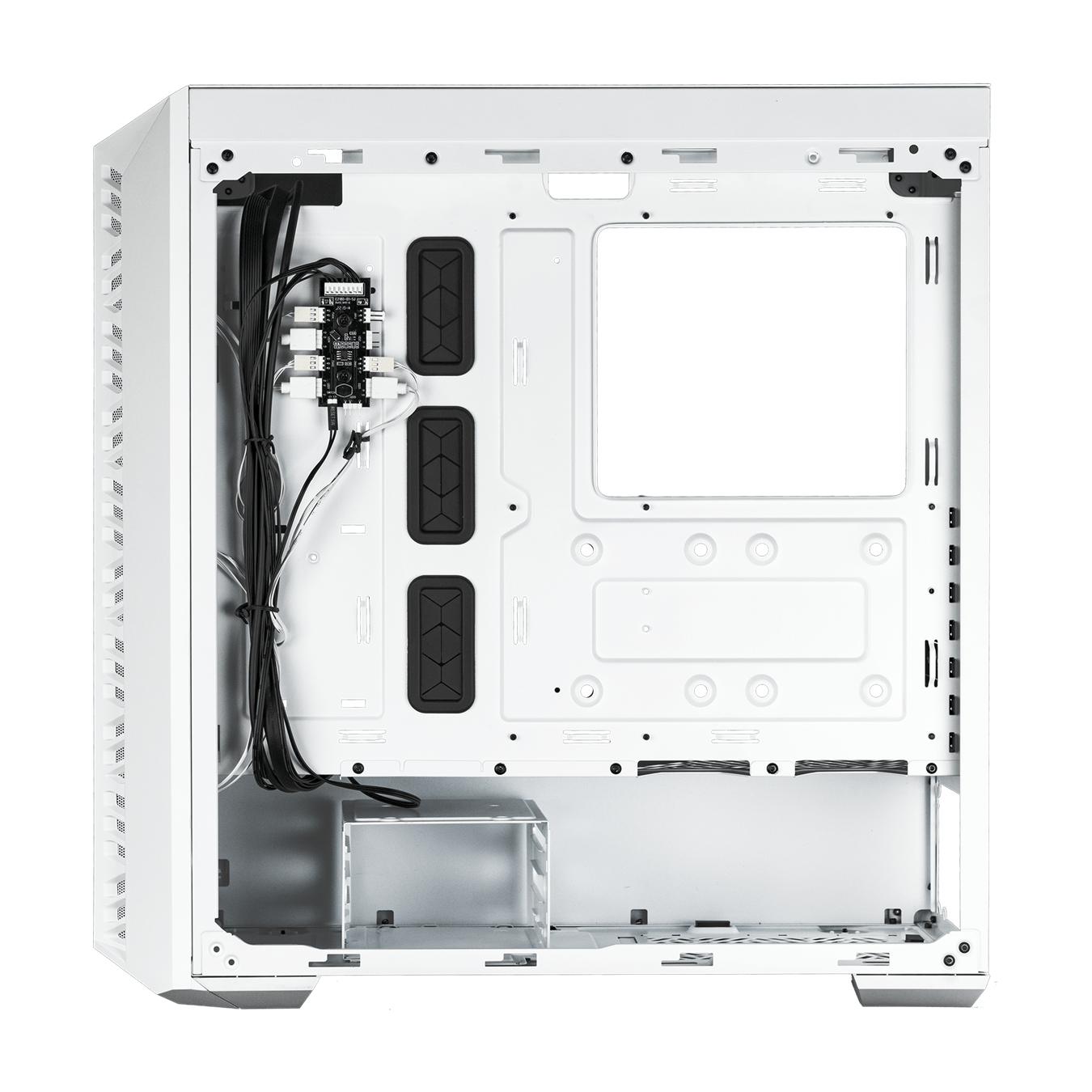 V skrini je zabudovaný modul s konektormi na pripojenie všetkých troch ventilátorov, tak čo sa týka regulácie výkonu, ako aj ovládania farebných svetelných efektov. Ventilátory sa pripájajú pomocou troch vodičov, takže nepodporujú PWM a regulujú sa zmenou jednosmerného napájacieho napätia. Túto metódu podporujú prakticky všetky základné dosky. V zadnej časti je miesto na inštaláciu ďalšieho 120 mm ventilátora. Bočný panel je z tvrdeného skla. V ponuke sú varianty v čiernej aj bielej farbe