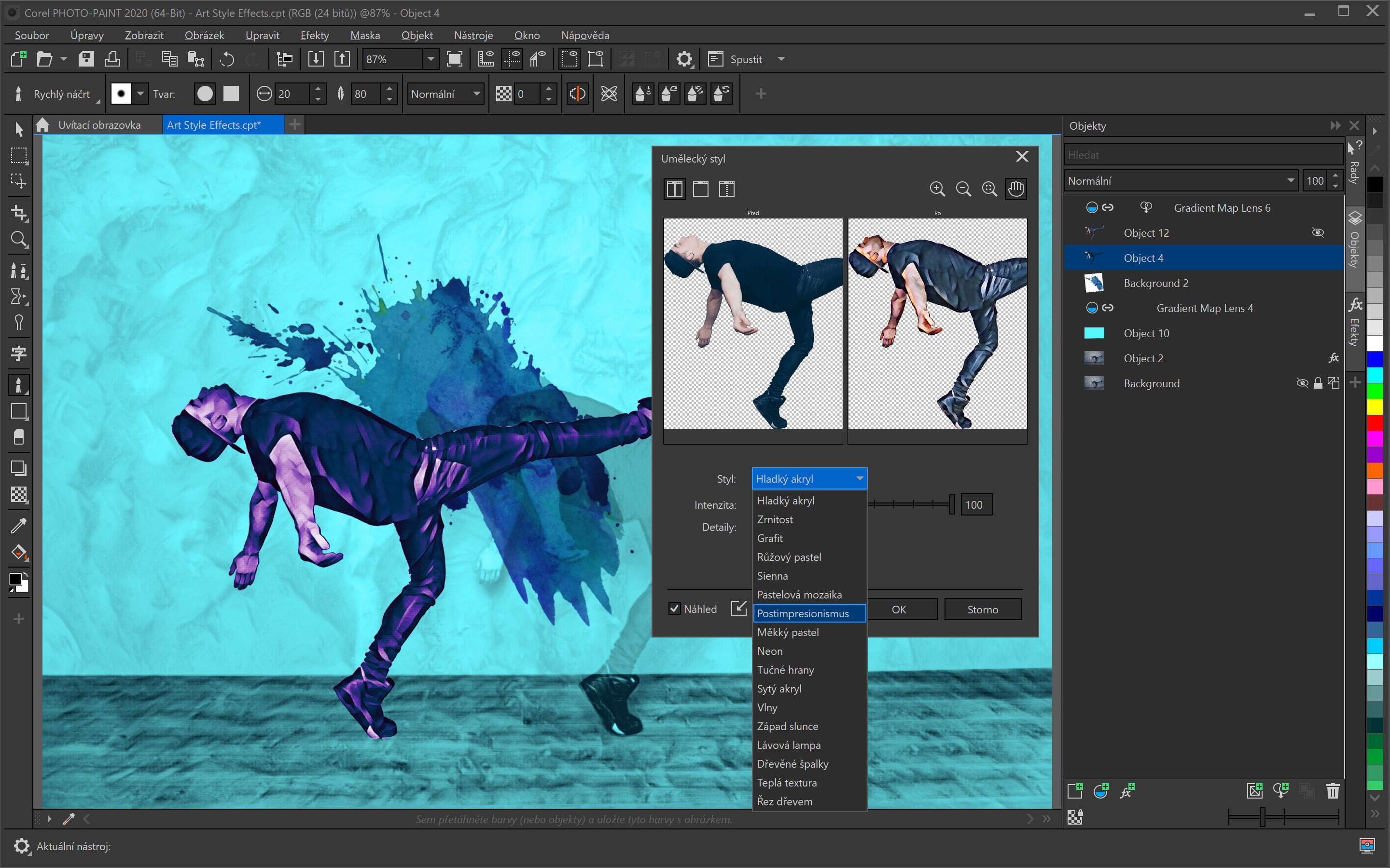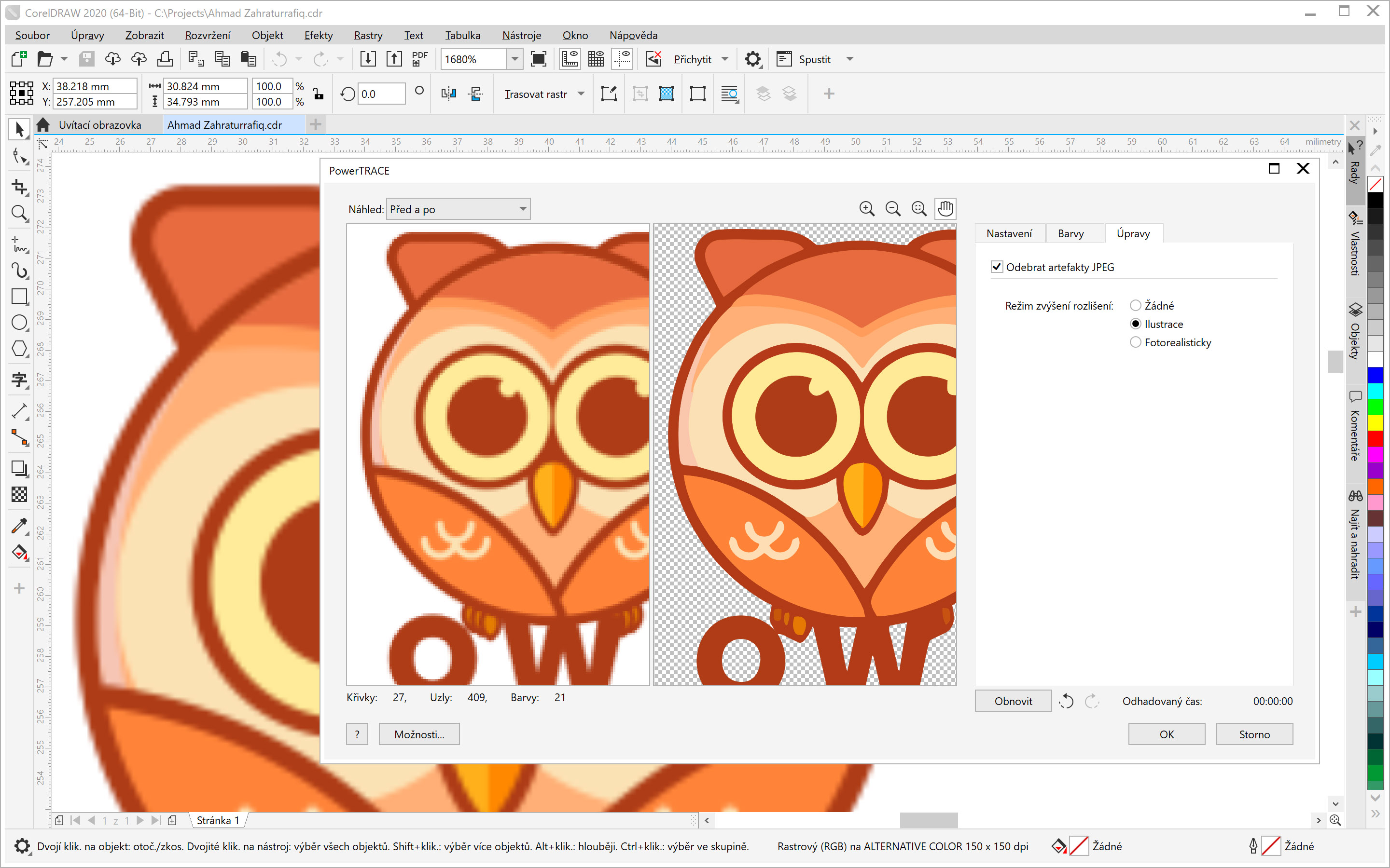Veľmi zaujímavé sú nástroje využívajúce umelú inteligenciu optimalizovanú na využitie GPU, vďaka čomu sa dosahuje úspora času a veľmi dobré výsledky. Prvá z týchto funkcií je zvýšenie rozlíšenia obrázkov a odobratie artefaktov. Vďaka technikám s pokročilým strojovým učením, ktoré odoberajú artefakty kompresie JPEG a obnovujú farebné detaily bez nutnosti jednotvárnych manuálnych úprav, získate z obrázkov so stratovou kompresiou JPEG maximum. Výsledky sa, samozrejme, líšia podľa predlohy, vcelku je však táto funkcia veľmi užitočná a ušetrí veľa času. Výsledky sú veľmi dobré, s hladkými a ostrými okrajmi. PowerTRACE teraz nájdete priamo v aplikácii CorelDRAW a ponúka veľmi kvalitný prevod rastrov na vektorové objekty. Funkcia má množstvo nastavení od rýchleho trasovania až po fotorealistický prevod. Rýchle trasovanie najčastejšie využijete, ak potrebujete upravovať nejaké logo. S novými nástrojmi je jeho prevod otázka chvíľky. Pri najvyššom nastavení dokáže prekonvertovať fotku v takej kvalite, že sotva rozoznáte rozdiel od originálu. V aplikáciách CorelDRAW a Corel PHOTO-PAINT pribudli efekty Umelecký štýl, v ktorých možno voliť zo širokej ponuky predvolieb, ktoré využívajú umelú inteligenciu trénovanú technikami rôznych umelcov a žánrov, a vytvárať tak štylizovanú verziu obrázka alebo objektu.