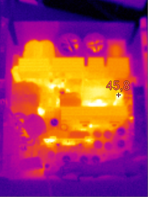 Na primári je dvojica veľkých kondenzátorov (420 V/330 μF/105 °C) Nichicon a sekundár je osadený Nippon Chemi-Conmi. Ide teda v tomto smere o veľmi slušne dimenzovaný high-end. Špičkové je i chladenie s poriadnymi pasívmi. Pri päťdesiatpercentnej záťaži som v najteplejšom mieste nameral 46 °C, čo nestojí za reč. Primerane tomu je tichý i ventilátor. Regulácia nepatrí medzi najinteligentnejšie, rýchlosť je väčšinu času v podstate fixná (okolo 850 ot./min) a ventilátor výrazne pridáva na otáčkach až pri trojštvrtinovej záťaži. Za normálnych okolností je do 50 % všetko pomerne tiché a k dokonalosti chýba už iba pasívny chod mimo záťaže PC.
