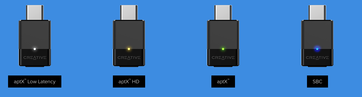 Pri použití zvukového adaptéra Creative BT-W3, ktorý sa pripája cez USB-C, ale v balení je aj praktická redukcia na klasický konektor USB-A si môžete vybrať, či uprednostníte aptX HD, kde je prioritou kvalita, takže je perfektný na počúvanie hudby, alebo kodek aptX LL (Low latency ) s oneskorením iba 40 ms, takže ponúka dokonalý zážitok z filmov a hrania hier. Na porovnanie základný kodek SBC má latenciu 4 – 6 krát dlhšiu. Kodek sa prepína tlačidlom a aktuálne vybraný kodek je signalizovaný farebnou LED. Kodek SBC je signalizovaný modrou, základný aptX zelenou, aptX HD žltou a aptX LL bielou farbou.