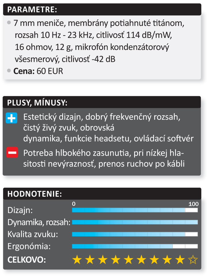 Na dizajne si dali tvorcovia záležať a už pri prvom pohľade vidno, že ide o prémiový produkt. Charakter zvuku je prekvapivo bohatý. Zdá sa, že tieto slúchadlá robia maximum, ktoré im 7 mm meniče dovolia. Aj človek ovplyvnený predsudkami k in-ear modelom musí uznať, že tu skutočne našiel dobre definované basy, správne vykreslené stredy aj ostré výšky. Jediný háčik je v tom, že slúchadlá treba zasunúť do ucha o čosi hlbšie, ako je pri tomto type bežné, čo môže niekomu fyzicky prekážať.