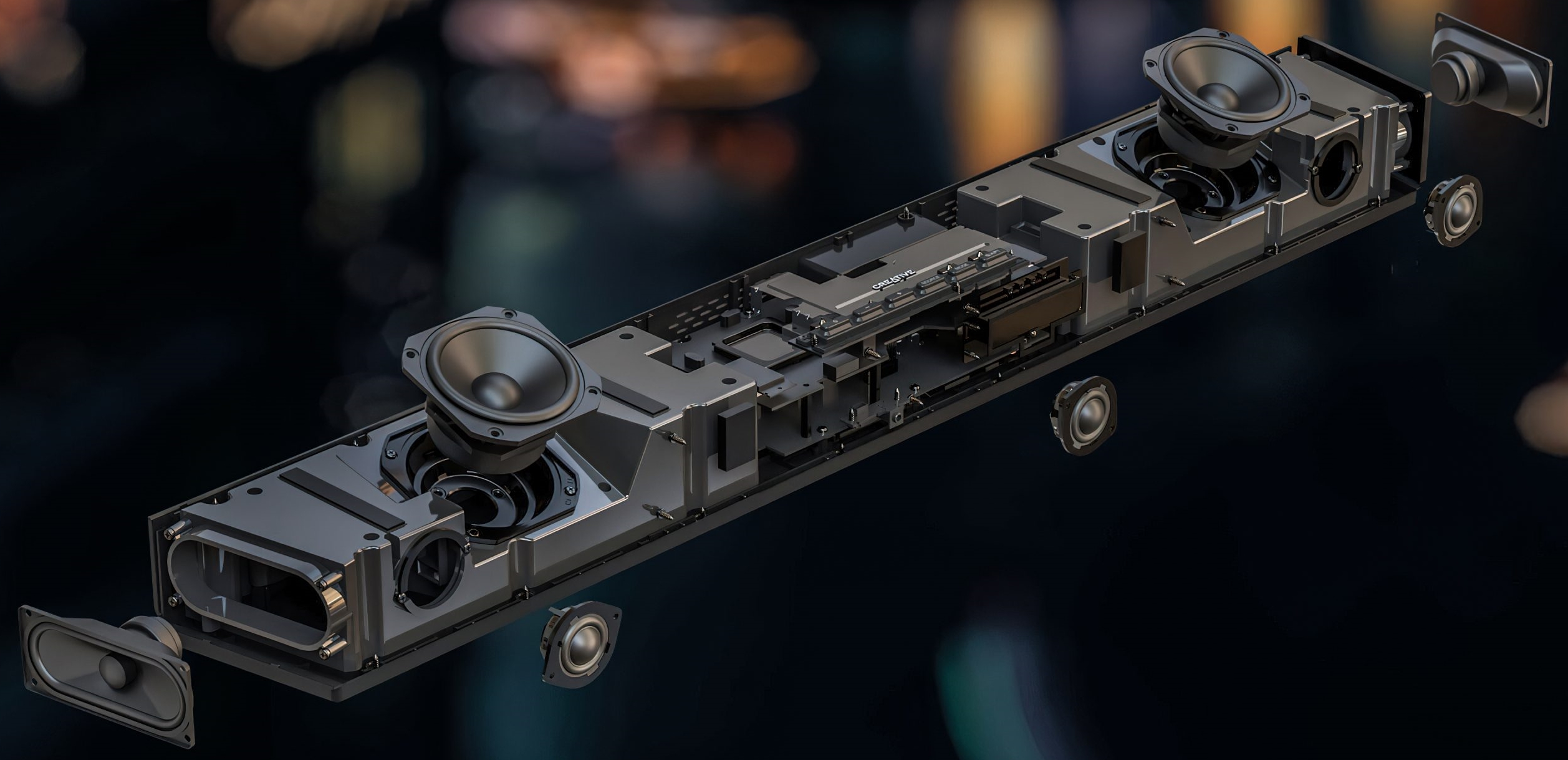 Priestorovú reprodukciu soundbaru zabezpečuje sedem akustických meničov. Tri smerujú dopredu priamo k poslucháčovi, dva na okrajoch vyžarujú zvuk šikmo do strán a dva meniče pod mriežkou horného panelu vyžarujú zvuk šikmo nahor, takže zvuk sa k poslucháčovi dostane odrazom od stropu a bočných stien. Subwoofer s 10 palcovým akustickým meničom a ladeným basreflexovým otvorom môžete k soundbaru pripojiť bezdrôtovo, alebo káblom s 3,5 mm Jack konektormi.