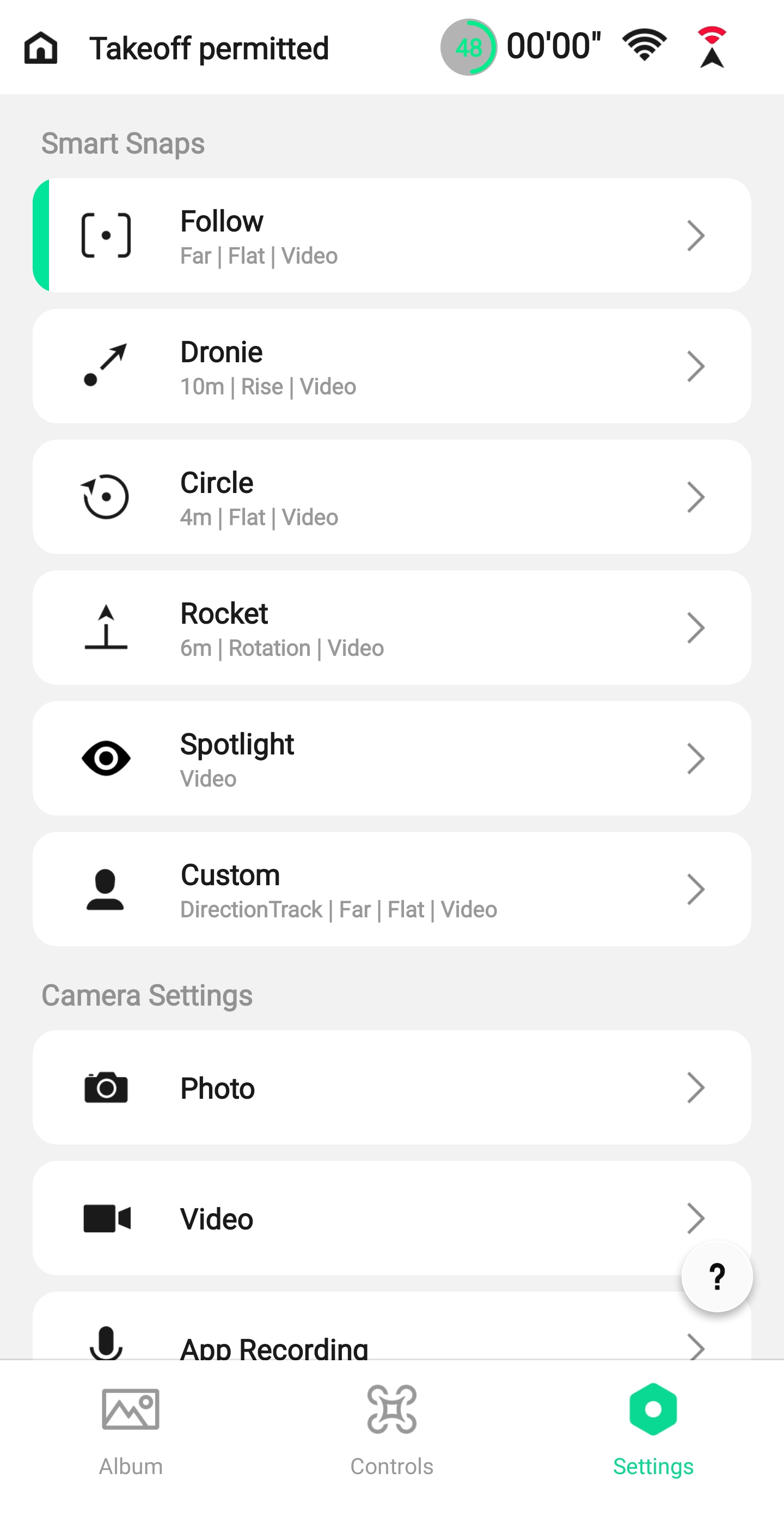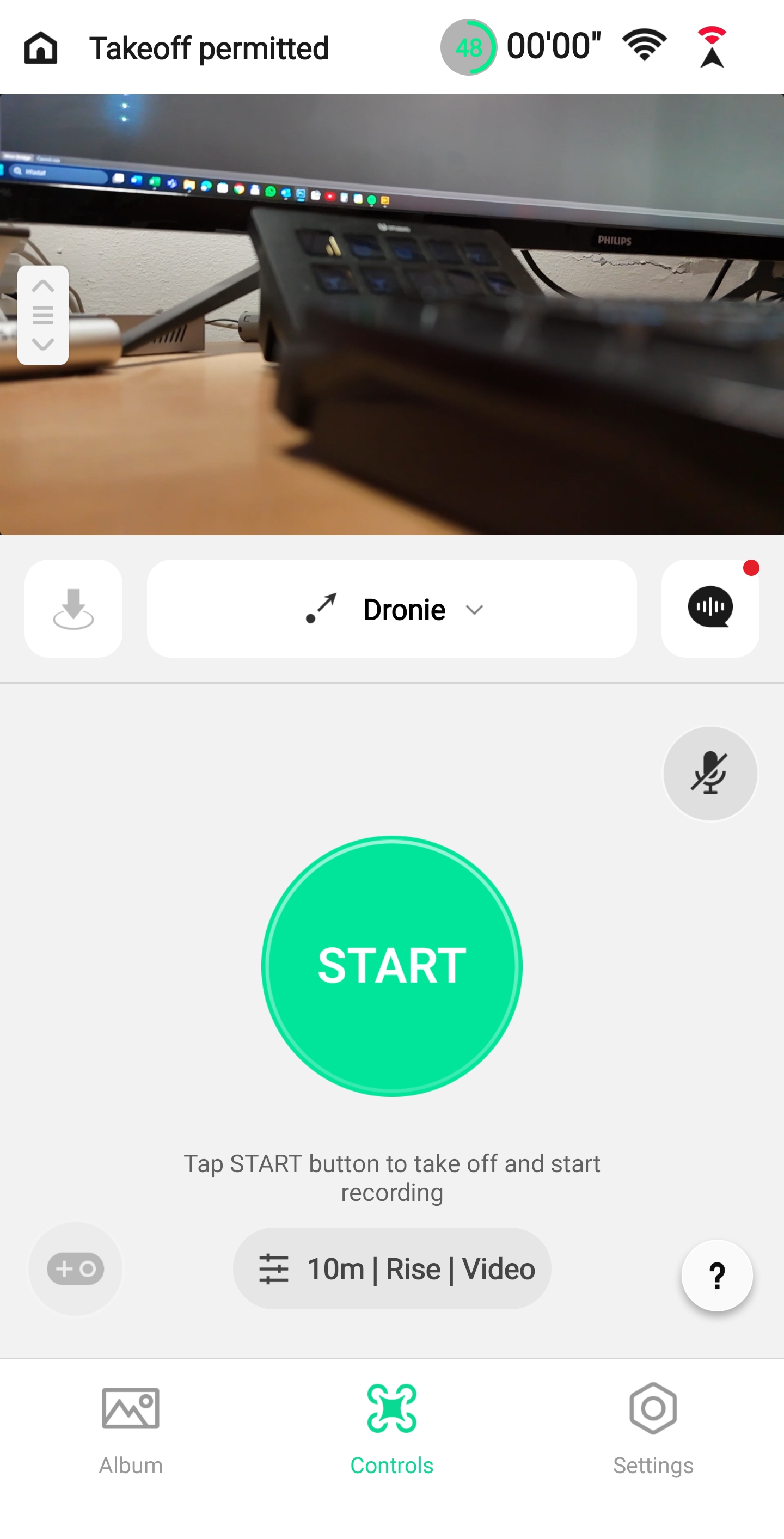 Pomocou mobilnej aplikácie môžete Flip pripojiť k smartfónu cez Wi-Fi a konfigurovať všetky predvolené režimy, prípadne ovládať dron, Aplikácia umožňuje aj hlasové ovládanie