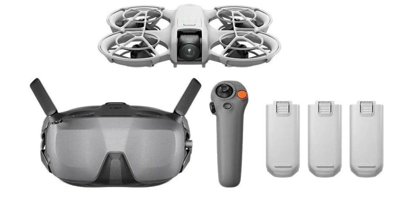 Obsah súčasťou DJI Neo Fly More Combo obsahuje: 1× Dron DJI Neo, 1× ovládač DJI RC Motion 3, 1× okuliare DJI Goggles N3, 1× ochrana vrtuľky, 1× nabíjací rozbočovač na 3 batérie, 3× letová batéria, 1× kábel USB-C na prepojenie so skrutkovačom, 1× kábel USB-C napájanie, 1× skrutkovač, 1× skrutkovač, 1× skrutka, 4 skrutky ochrana a držiak na stabilizačný záves