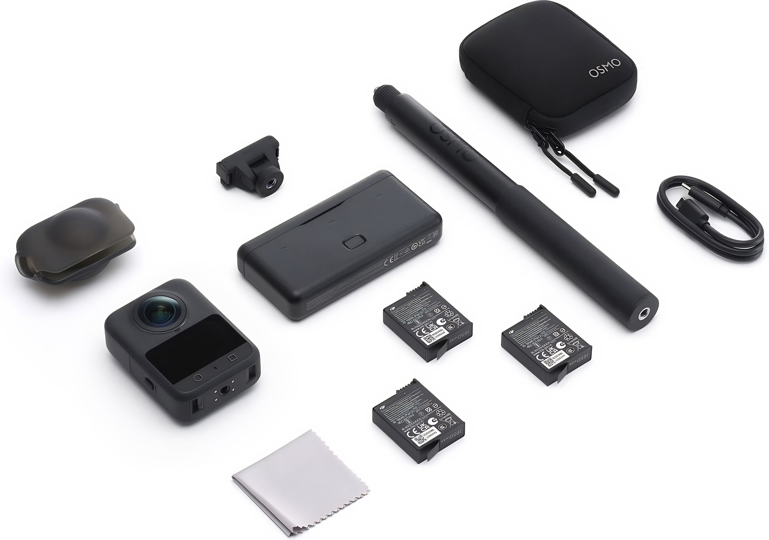Model: DJI Osmo 360, rozmery: 61 × 36,3 × 81 mm, hmotnosť: 183 g, ochrana: IP68, telo kamery do 10 m pod vodou, 4 mikrofóny, dotykový displej: 2,0" (314 × 556, 800 cd/m²), snímač: 1/1,1" CMOS, svetelnosť: f/1,9, ISO 100 – 51 200, max. foto rozlíšenie panoráma: 15 520 × 7760 (120 Mpx), max. foto rozlíšenie jeden snímač: 6400 × 4800 (30,72 Mpx), max. video panoráma: 8K 7680 × 3840 až 50 fps, 6K 6000 × 3000 až 60 fps, 4K 3840 × 1920 až 100 fps, max. video jeden snímač: 5K 5120 × 2880 až 60 fps, 4K 3840 × 2160 až 120 fps, elektronická stabilizácia: RockSteady 3.0, HorizonSteady, max. dátový tok videa: 170 Mb/s, vnútorné úložisko: 128 GB (asi 105 GB dostupných), podpora microSD až 1 TB, formát fotiek: JPEG, formát videa: OSV, MP4 (HEVC), nahrávanie audia: 48 kHz/16-bit AAC, batéria: Li-ion 1S 1950 mAh (7,5 Wh, 3,87 V), výdrž: až 100 min 8K/30 fps panoráma alebo až 190 min 6K/24 fps panoráma (laboratórne hodnoty), prevádzková teplota: -20 až 45 °C, Wi-Fi 6 (2,4/5 GHz), Bluetooth 5.1, USB 3.1 Type-C (prenos až 600 MB/s)