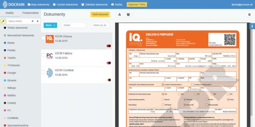 Dokumenty sú rozdelené do dvoch kategórií. Časť Moje dokumenty zobrazuje zoznam všetkých naskenovaných dokumentov, ale aj tých, ktoré ste si do aplikácie vložili sami. Druhá sekcia Fyzické dokumenty zobrazuje iba tie, ktoré máte fyzicky uložené v archíve DOCKitIN. Veľká výhoda je zdieľanie dokumentov. Faktúru alebo zmluvu zdieľate prostredníctvom pridania mailu. Následne vybranému používateľovi príde pozvánka na vstup do služby. S každým dokumentom môžete ďalej pracovať. Jedným kliknutím pošlete požiadavku na vytvorenie notársky osvedčenej kópie vybranej zmluvy. Ak náhodou potrebujete originál dokumentu, ktorý je uložený vo fyzickom archíve, opäť vám stačí jedno stlačenie tlačidla a dokument príde na adresu, ktorú si určíte. V prípade pravidelne sa opakujúcich faktúr možno vytvoriť aj notifikáciu, ktorá vás vždy v rovnakom čase upozorní na termín splatnosti.