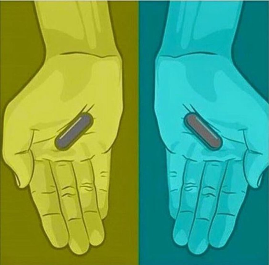 Na obrázku sa nachádzajú dve ruky - jedna je zafarbená nažlto, druhá namodro. Obe ruky držia pilulku. A práve toto je objekt, ktorého sfarbenie vnímajú ľudia odlišne. Niekomu obe z tabletiek pripadajú sivé, iní vidia v modrej dlani červenú tabletku a v žltej dlani sivú. Ďalší vnímajú pilulku vľavo ako modrú a tú vpravo zasa ako červenú. A ako ich vidíte vy?