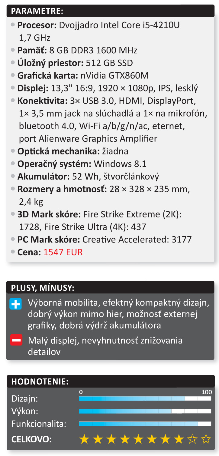 Model Alienware 13 existuje v množstve rôznych variantov, a tak si ho možno jemne dolaďovať podľa vlastných požiadaviek. Vo vyhotovení, v ktorom sme ho testovali, postačí na prevádzkovanie najnovších hier približne na stredných detailoch. Bez „steroidov“ v podobe Graphics Amplifiera je určený menej náročnému hráčovi alebo tomu, ktorý potrebuje čo najvyššiu mobilitu. Vedľajší účinok dobrého výkonu je veľké pohodlie v činnosti mimo hernej sféry, spôsobené hlavne veľkým a rýchlym SSD. Jediný výrazný, no kompenzovateľný nedostatok je malý displej.