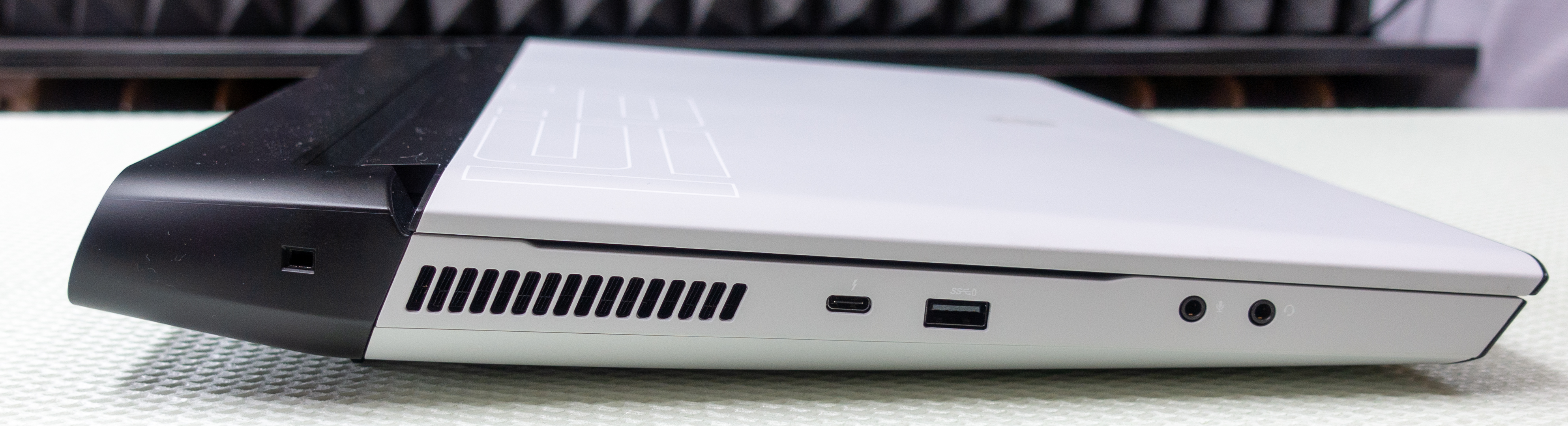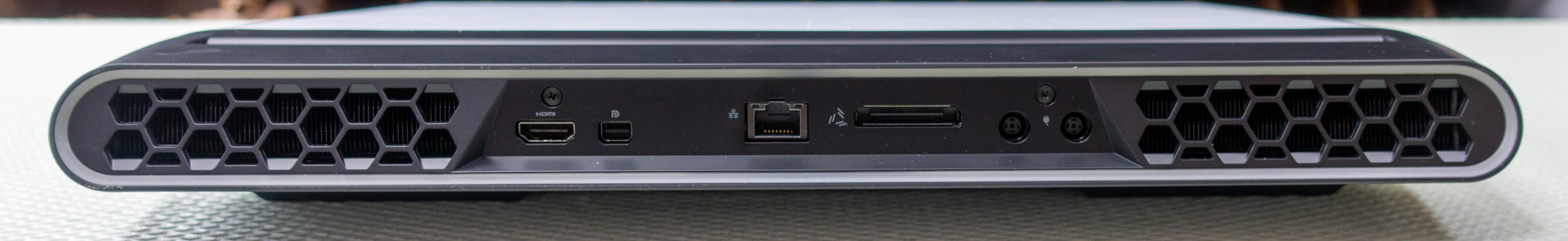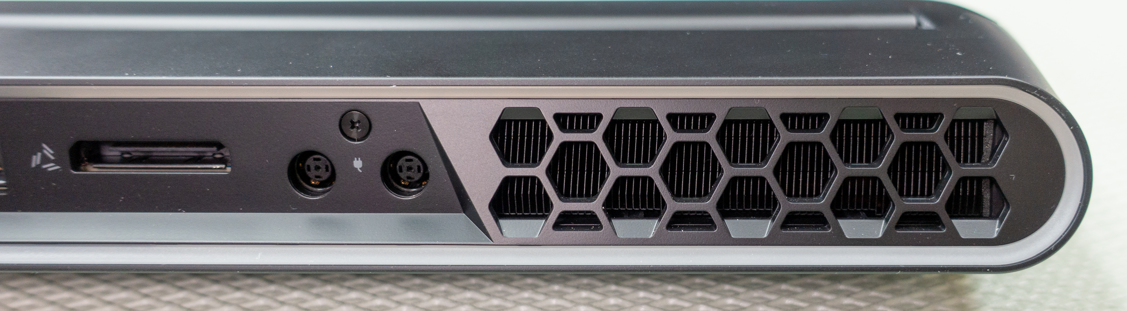 Dell Alienware 17 Area-51m teda má desktopový procesor, ale grafický čip je notebookový. Zabudovanie výkonnej desktopovej grafickej karty by si vyžiadalo priveľké rozmery zariadenia. Preto to vyriešili inak. Na zadnej strane okrem známych typov konektorov nájdete aj jeden proprietárny, určený na pripojenie zariadenia Alienware Graphics Amplifier. Je to samostatná skrinka s vlastným 460 W zdrojom, do ktorej si dáte grafickú kartu s takým výkonom, aký potrebujete.