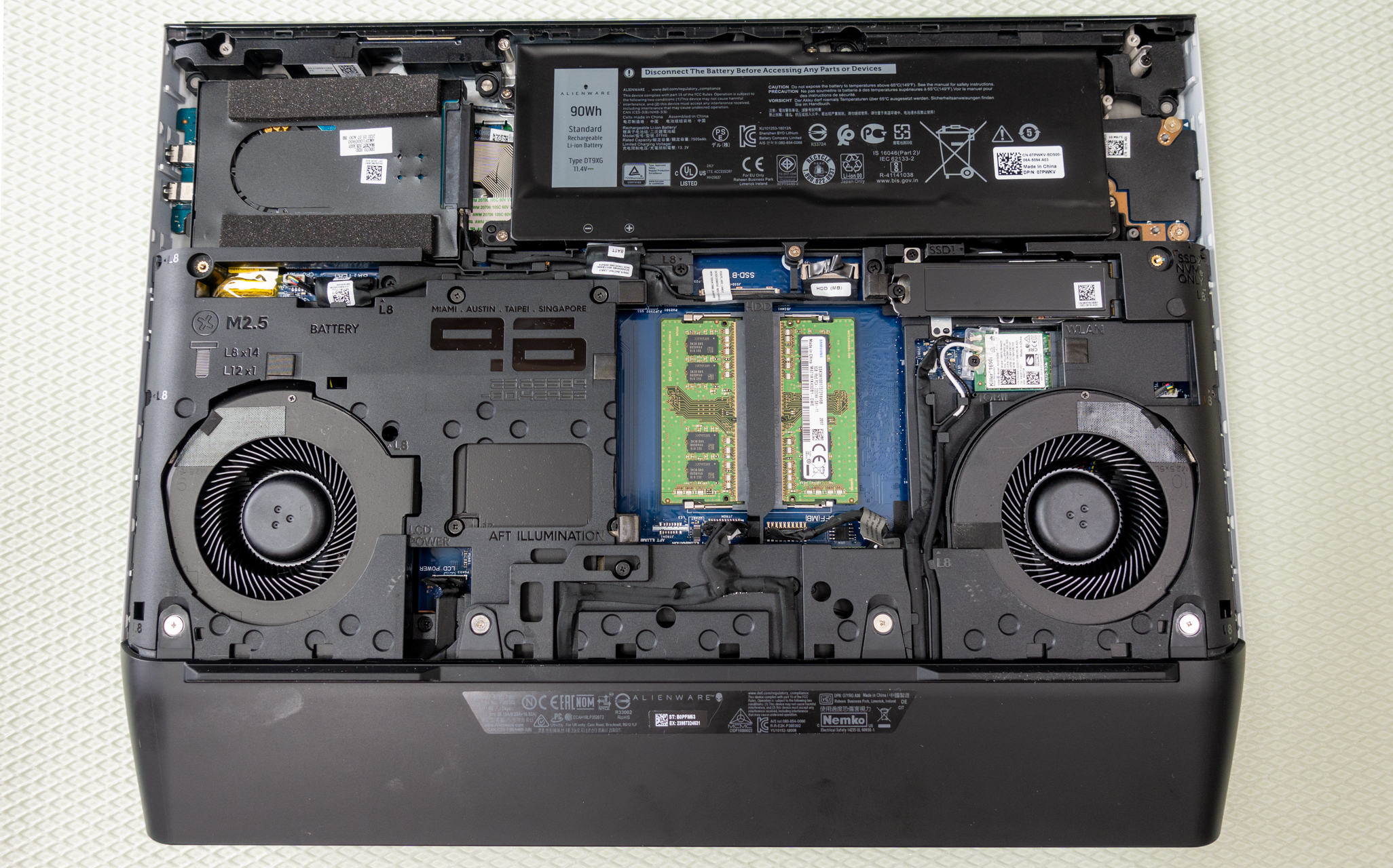 Telo notebooku je z kvalitného plastu. Model, ktorý som testoval, bol vo farebnej kombinácii biela – tmavosivá. Farebné podsvietenie má nielen klávesnica, tlačidlo na zapnutie, logo Alienware na opačnej strane panela displeja a zaoblený rámik okolo zadnej steny, ale aj plocha touchpadu. Je to veľmi efektné. Podsvietenie sa nastavuje, prípadne sa dá aj vypnúť v aplikácii Alienware Command Center. Tu môžete nastaviť aj režimy chladenia či pretaktovanie procesora. Keď sa už konštruktéri rozhodli dať hernému notebooku čo najviac atribútov herného PC, nezabudli ani na rozšíriteľnosť. Spodné veko sa dá po odskrutkovaní niekoľkých štandardných skrutiek ľahko odobrať. V konfigurácii, ktorú som testoval, boli dva pamäťové moduly po 8 GB. Ich výmenou rozšírite kapacitu pamäte. Operačný systém je na disku SSD s kapacitou 256 GB. Zabudovaný je aj klasický mechanický disk s kapacitou 1 TB a k dispozícii je ešte jeden slot na polovodičový disk, ale musí byť typu NVMe.