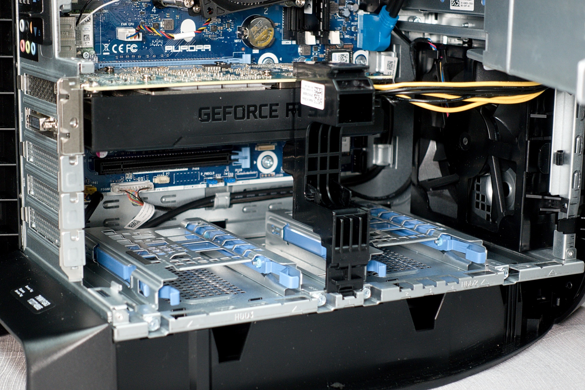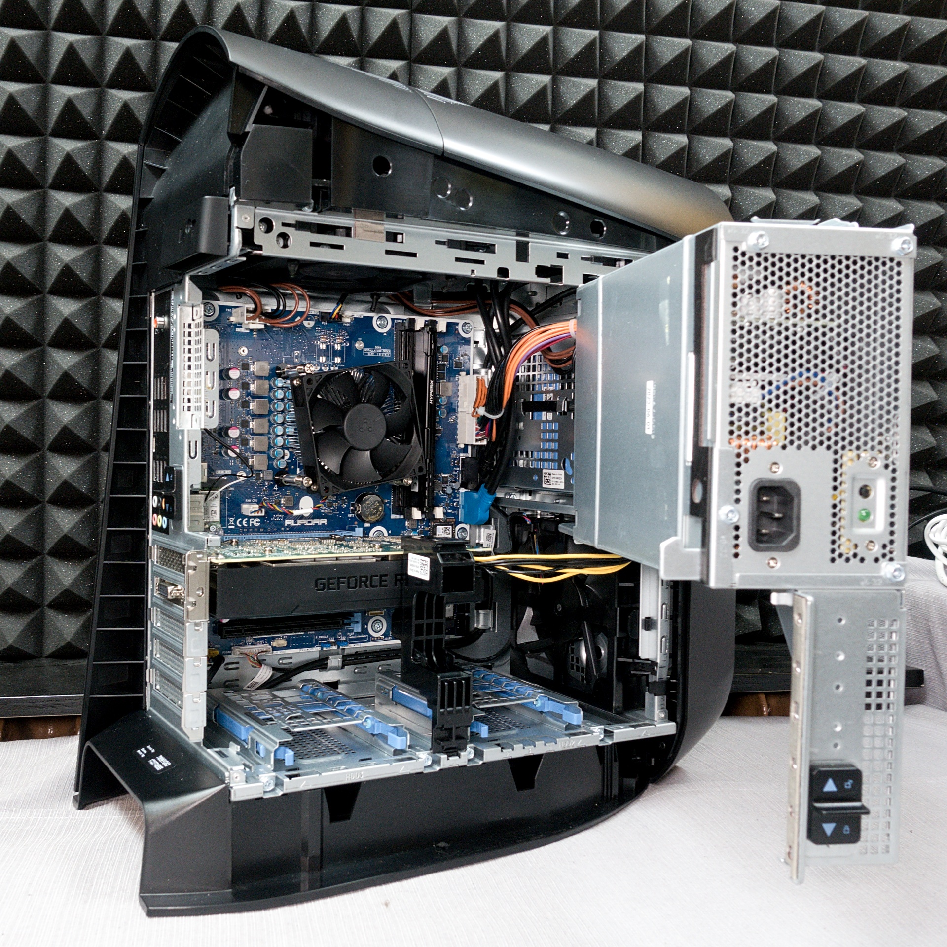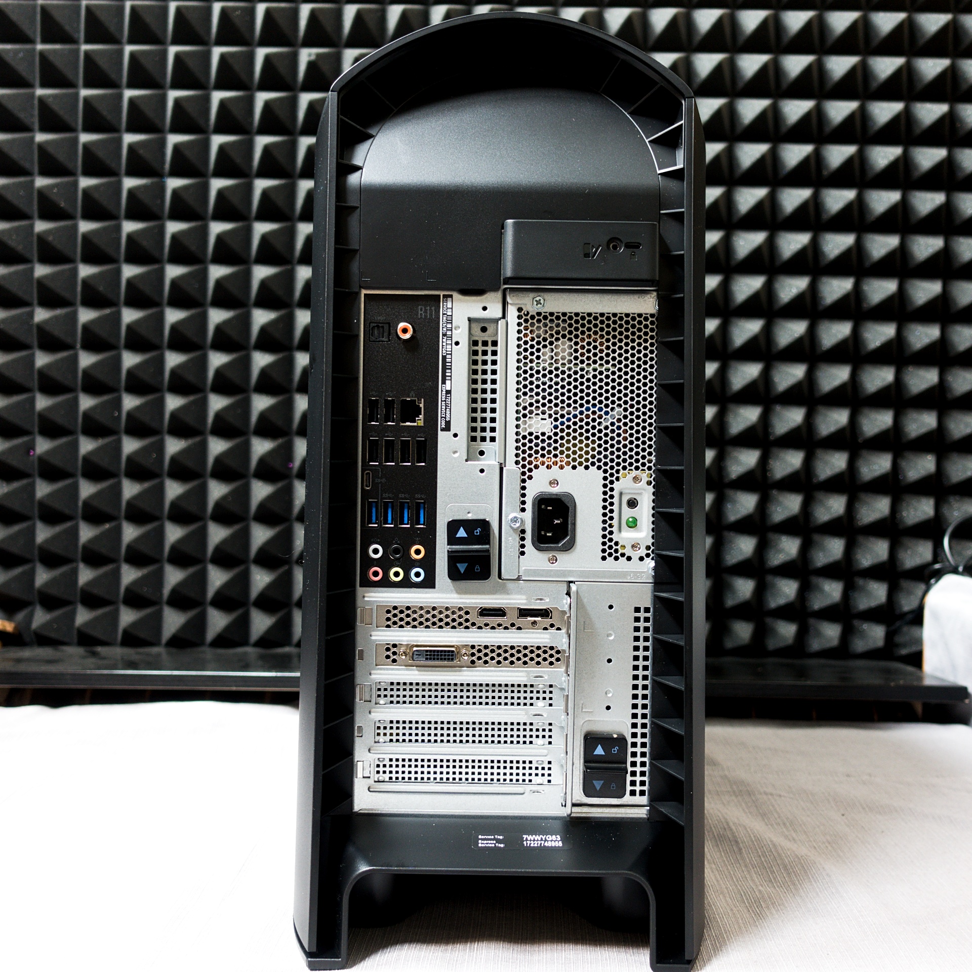V strede predného panelu je úzka zvislá oválna plocha s podsvieteným orámovaním. Je na nej vypínač v tvare podsvieteného loga Alienware a taktiež USB a audio porty na operatívne používanie. Podsvietenie si môžete naprogramovať podľa svojho vkusu, prípadne hry, ktorú práve hráte. Vzduch sa nasáva štrbinou po obvode tejto plochy a ohriaty sa vyfukuje nahor v zadnej časti horného panelu. Presnejšie ventilátor za dizajnovo funkčnou prednou maskou nasáva vzduch do vnútra skrinky počítača a taktiež dovnútra odklopného modulu napájacieho zdroja. Vzduch sa nasáva aj cez dva okrúhle otvory v ľavej bočnej stene. Ďalší ventilátor v hornej časti zas vyfukuje ohriaty vzduch. Mimochodom pri konzervatívnom nastavení podsvietenia bude tento počítač vhodný aj na pracovný stôl inžiniera, či kreatívneho tvorcu multimédií.