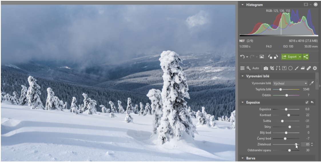 Úpravami expozície získate kontrastnú fotku, na ktorej lepšie uvidíte efekt vyrovnania bielej. Túto funkciu nájdete v pravom paneli nad záložkou Expozícia.