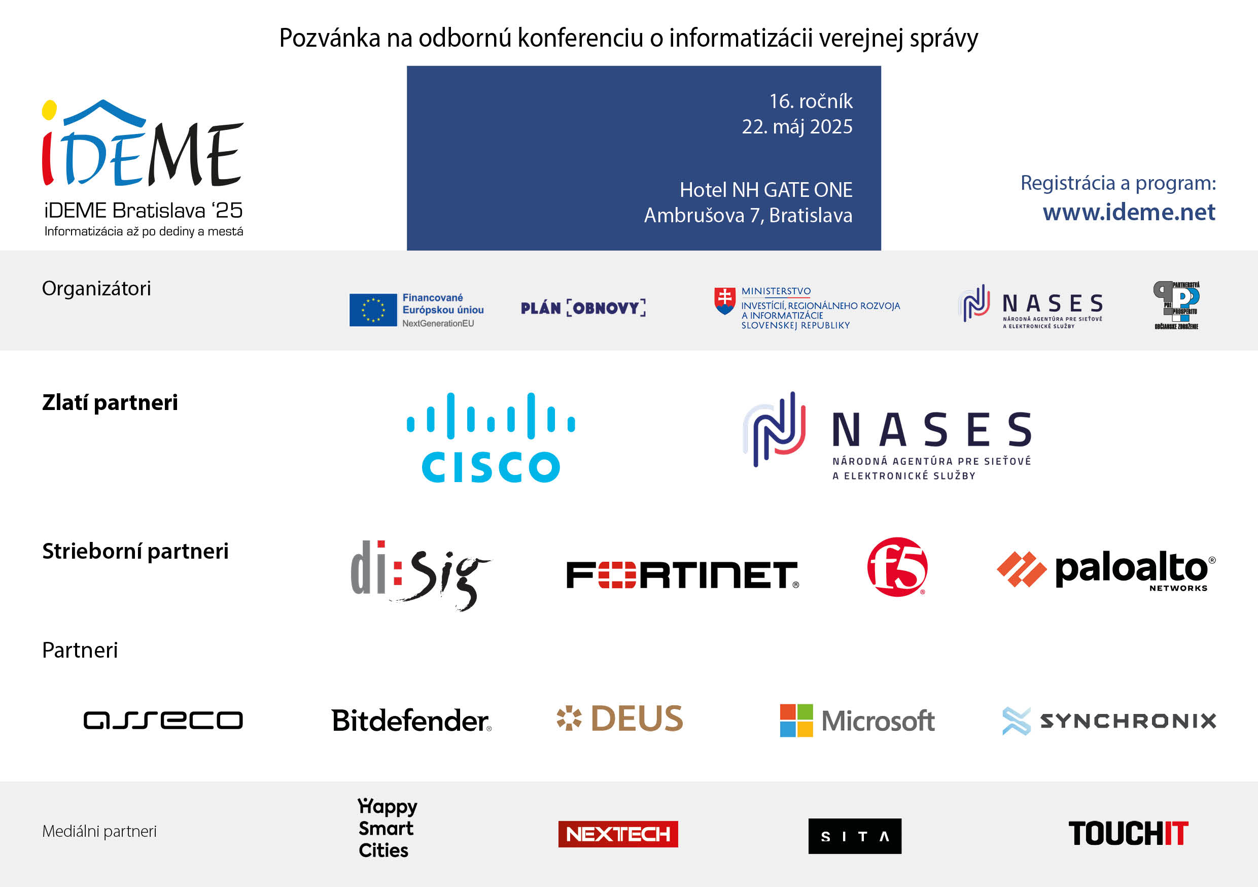 Odborná konferencia iDEME 2025 (Informatizácia až po dediny a mestá) sa uskutoční už budúci štvrtok 22. mája 2025 v bratislavskom hoteli NH GATE ONE. Jej organizátorom je občianske združenie Partnerstvá pre prosperitu (PPP) v spolupráci s Národnou agentúrou pre sieťové a elektronické služby (NASES).