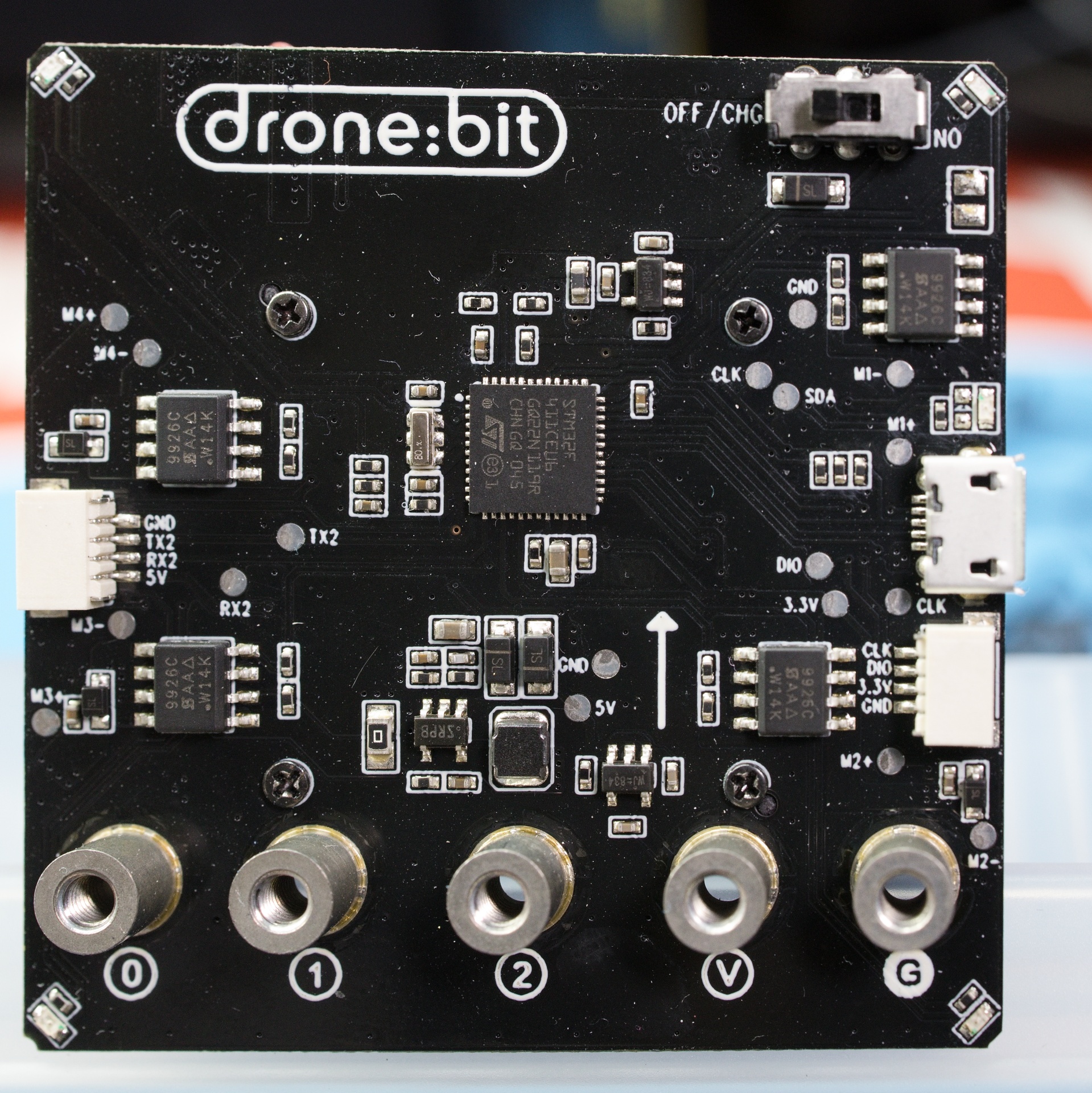Micro:bit nie je súčasťou balenia, je potrebné kúpiť ho zvlášť. K doske riadiacej elektroniky drona sa upevní pomocou piatich skrutiek, ktoré zabezpečia aj prenos napájacieho napätie, GND, čiže elektrickej zeme a troch signálov P0, P1 a P2.